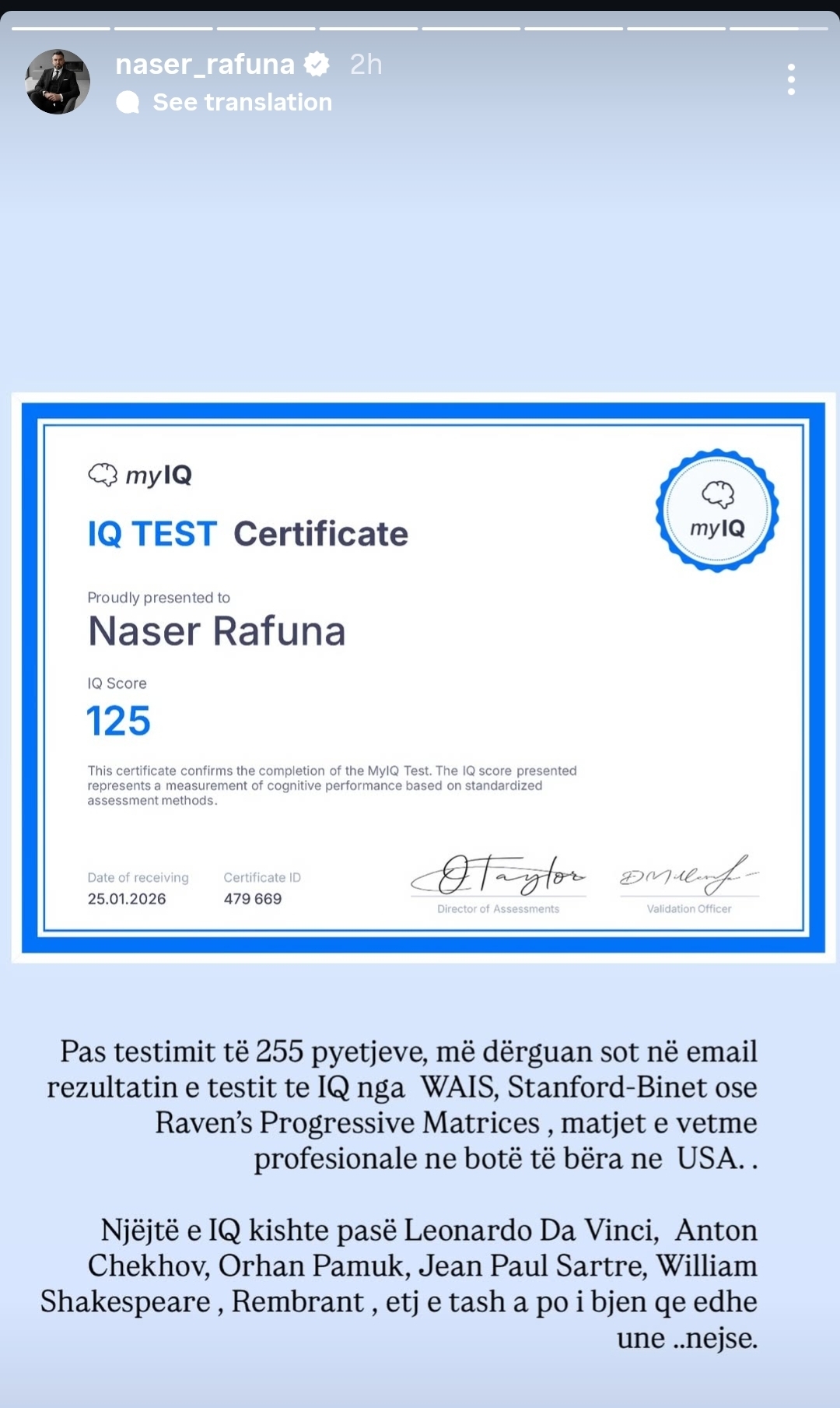 Në mbishkrimin e tij, ai përmend se të njëjtin nivel inteligjence e kishin edhe kolosë si Leonardo Da Vinci, William Shakespeare, Jean Paul Sartre e Rembrandt.
