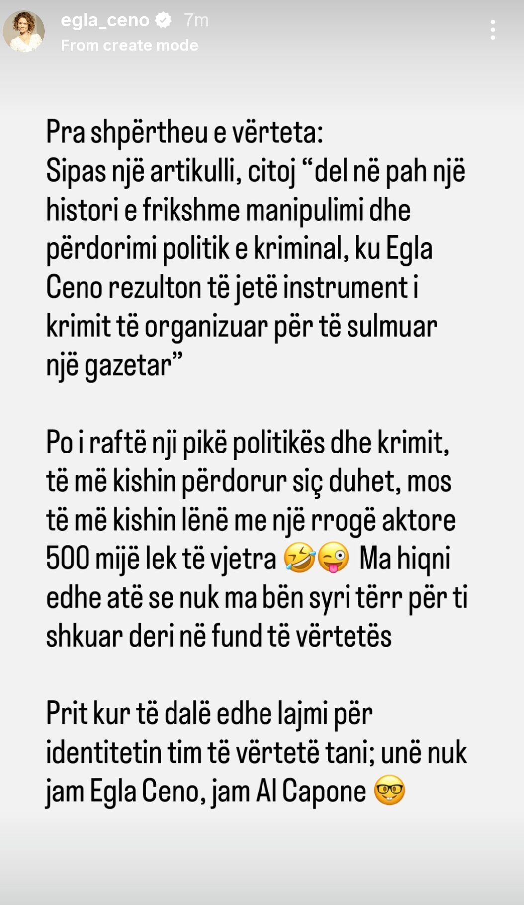 Aktorja e njohur shprehet me tonë thumbues se “po të kishte pasur lidhje me politikën apo krimin, nuk do të mbetej me një rrogë aktoreje prej 500 mijë lekësh të vjetra”. Ajo shton se nuk do të ndalet “deri në fund të së vërtetës”, ndërsa me humor e përmbyll reagimin me fjalinë: “Unë nuk jam Egla Ceno, jam Al Capone”.