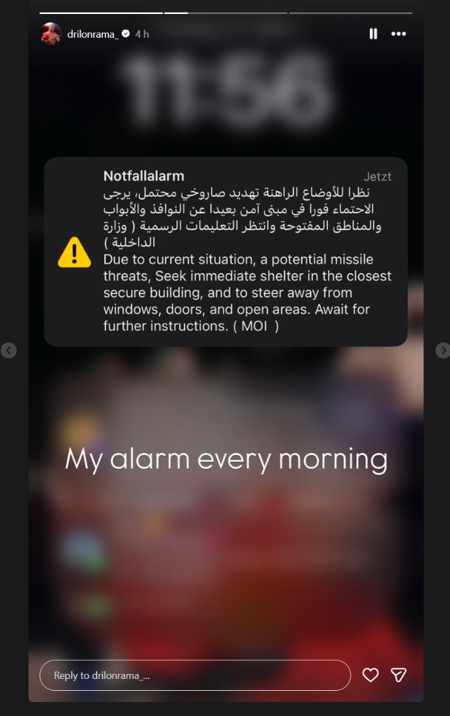 Ai ka publikuar alarmin emergjent të sigurisë ku autoritetet i njoftojnë qytetarët duke u shkruar: “Për shkak të situatës aktuale, një kërcënim i mundshëm nga raketat, kërkoni strehim të menjëhershëm në ndërtesën e sigurt më të afërt dhe qëndroni larg dritareve, dyerve dhe zonave të hapura. Prisni për udhëzime të mëtejshme”.