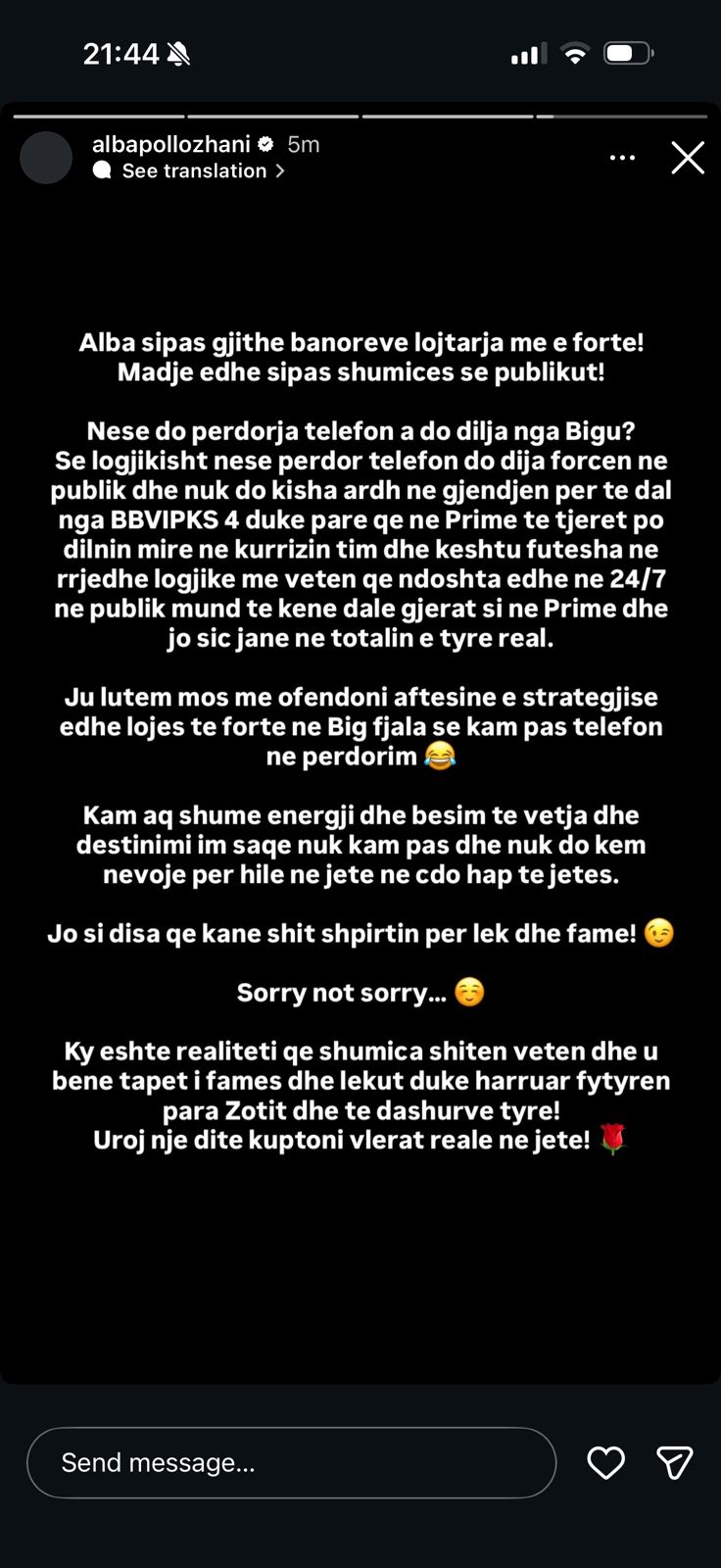 Me një ton të prerë dhe plot ironi, Alba argumenton se nëse do të kishte vërtet akses në botën e jashtme, do ta dinte saktësisht mbështetjen e publikut dhe nuk do të lejonte kurrsesi që të tjerët të dilnin mirë në kurrizin e saj gjatë spektakleve të Prime-it. Ajo shton se nuk ka pasur asnjëherë nevojë për hile në rrugëtimin e saj, duke qenë e mbushur me besim të plotë dhe energji për atë që i ka rezervuar fati.