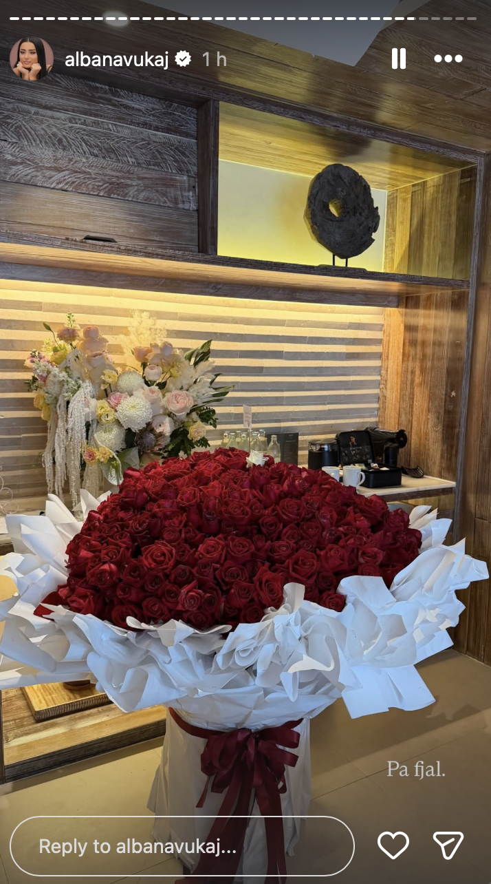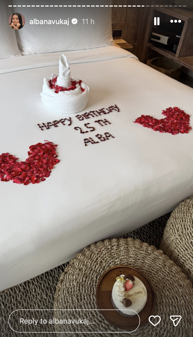 Përmes postimeve në Instagram, Alba ka ndarë me ndjekësit atmosferën festive. Ajo u mirëprit në dhomën e saj me një dekorim romantik me petale trëndafili ku shkruhej “Happy Birthday 25th Alba”. Por vëmendjen më të madhe e mori një buqetë gjigante me qindra trëndafila të kuq, për të cilën Alba shkroi thjesht: “Pa fjalë”.