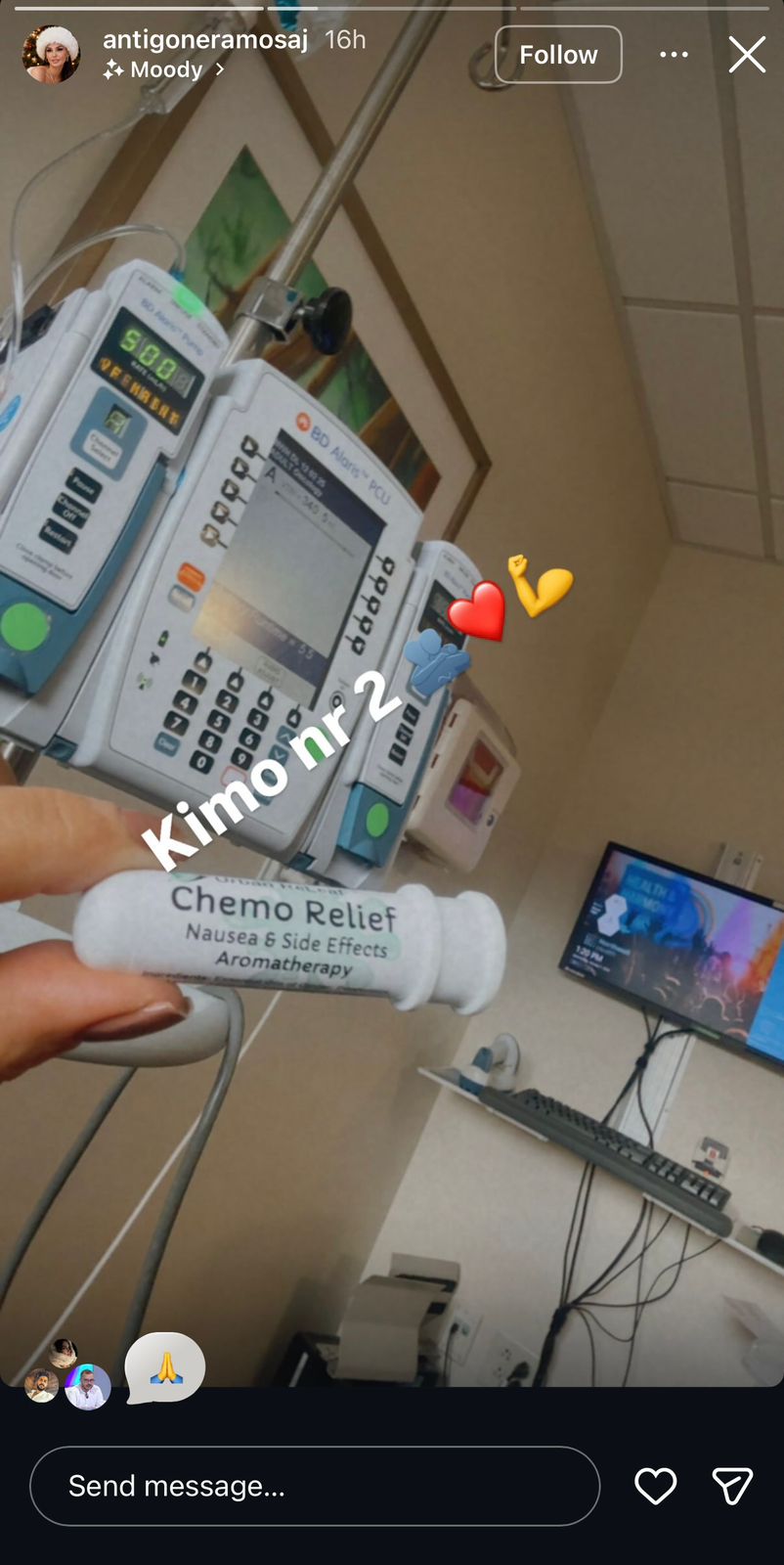 Krahas fotos ku shfaqen pajisjet mjekësore dhe një produkt aromaterapie për lehtësimin e efekteve anësore, ajo ka shkruar: