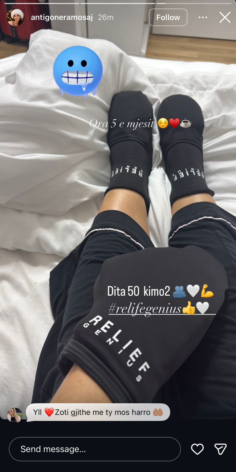Në një tjetër postim në orët e para të mëngjesit, ajo shfaqet duke përdorur doreza dhe çorape të specializuara (Relief Genius) për të menaxhuar të ftohtit, një efekt i njohur i trajtimeve të tilla.
