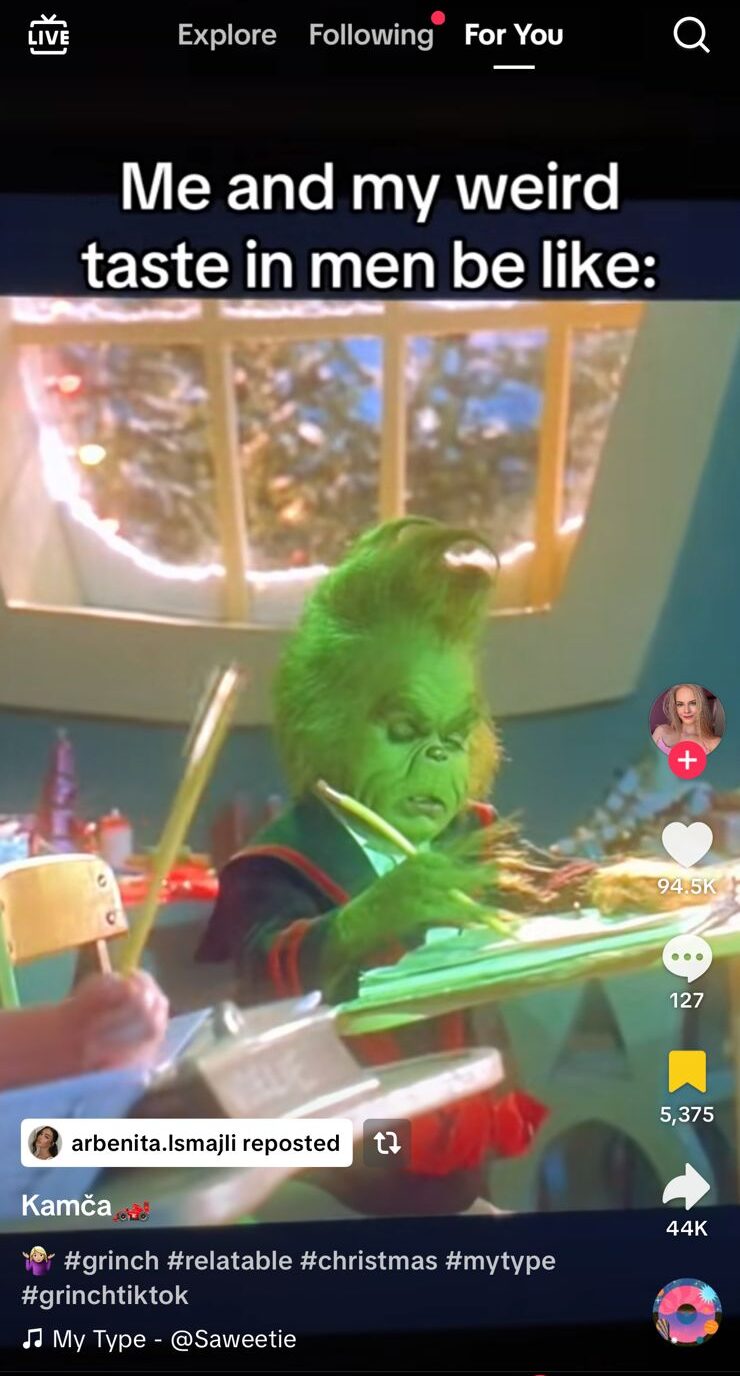 Në profilin e saj, modelja ka ripostuar një video ku shfaqet personazhi i famshëm “The Grinch” gjatë fëmijërisë, shoqëruar me mbishkrimin: “Unë dhe shija ime e çuditshme për meshkujt”.