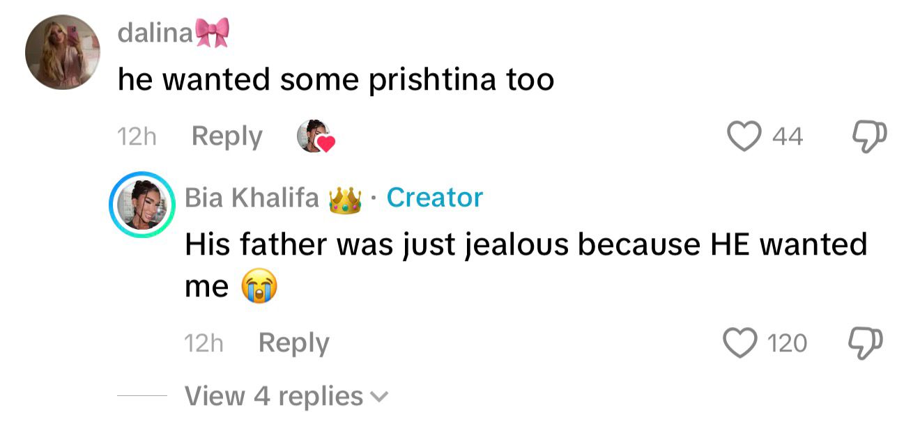 Përveç videos, vëmendje të madhe ka marrë edhe një koment i Bias në po të njëjtin postim. Duke iu përgjigjur një ndjekësi që shkroi se babai i Toney-t “donte pak Prishtinë gjithashtu”, Bia u përgjigj me tone mjaft ironike: “Babai i tij ishte thjesht xheloz sepse ai më donte mua”. Me këtë deklaratë, Bia ndezi rrjetin duke lënë kokludime te ndjekësit se arsyeja e vërtetë pse ai kërkoi që Toney të qëndronte larg saj nuk ishte mosmiratimi prindëror, por një pëlqim personal i fshehur.
