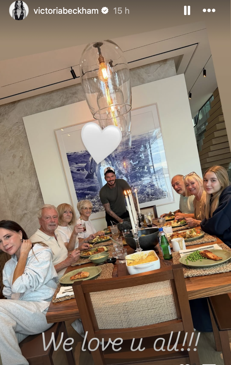 Në fund, Victoria ndau edhe një foto familjare të ngrohtë, ku shihen prindërit e çiftit dhe vajza e tyre Harper, 14 vjeçe, duke shijuar së bashku darkën në tryezën e madhe familjare.