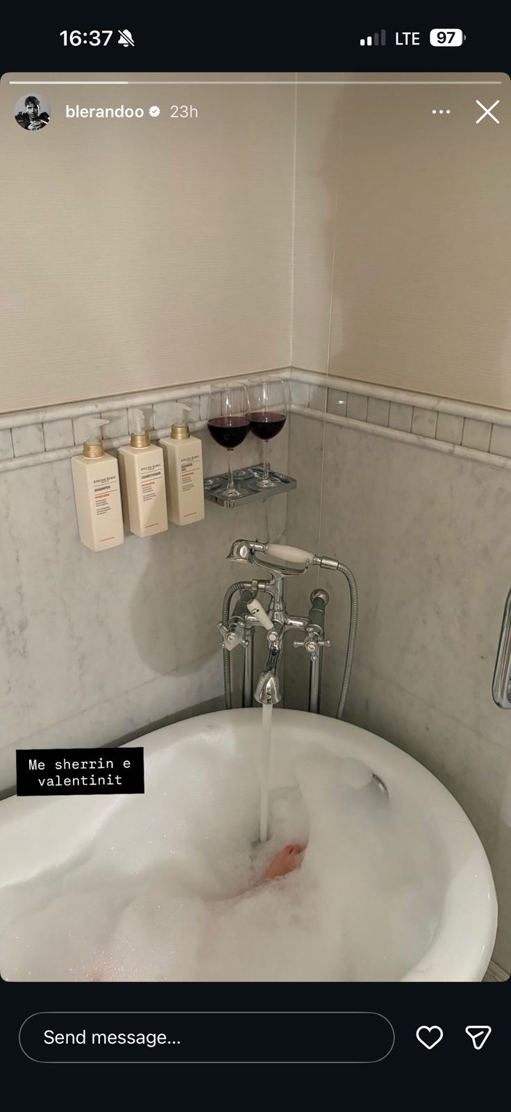 Edhe pse profili i tij në rrjetet sociale është zakonisht i mbushur me angazhime profesionale dhe muzikë, Story i fundit i këngëtarit tregoi një atmosferë krejt tjetër. Blerando publikoi një foto nga një moment relaksi në vaskë, ku detaji që ra menjëherë në sy ishin dy gotat e verës së kuqe, duke konfirmuar se ai po shijonte një mbrëmje romantike “vete i dyti”.