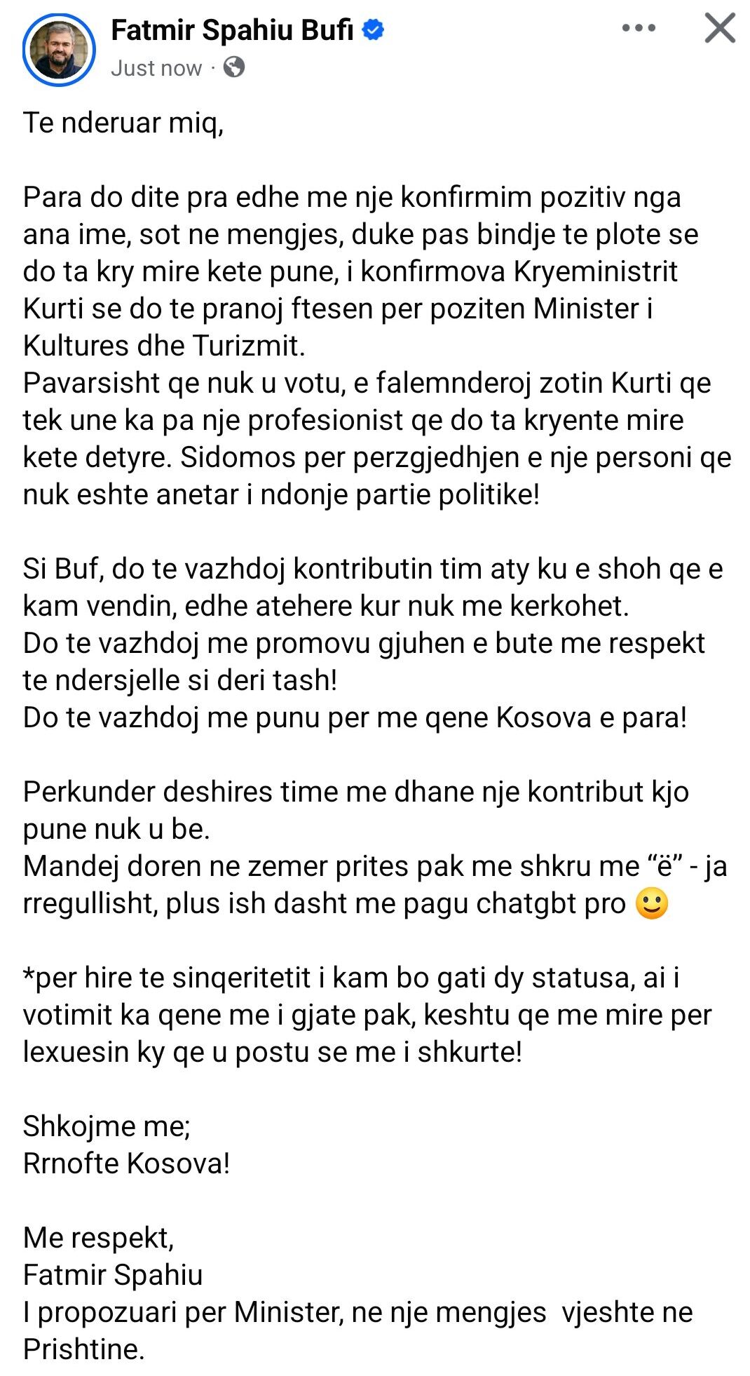 “Para do dite pra edhe me një konfirmim pozitiv nga ana ime, sot në mëngjes i konfirmova Kryeministrit Kurti se do ta pranoj ftesën për pozitën Ministër i Kulturës dhe Turizmit. Pavarësisht që nuk u votu, e falënderoj zotin Kurti që tek unë pa një profesionist që do ta kryente mirë këtë detyrë, sidomos për përzgjedhjen e një personi që nuk është anëtar i ndonjë partie politike.”