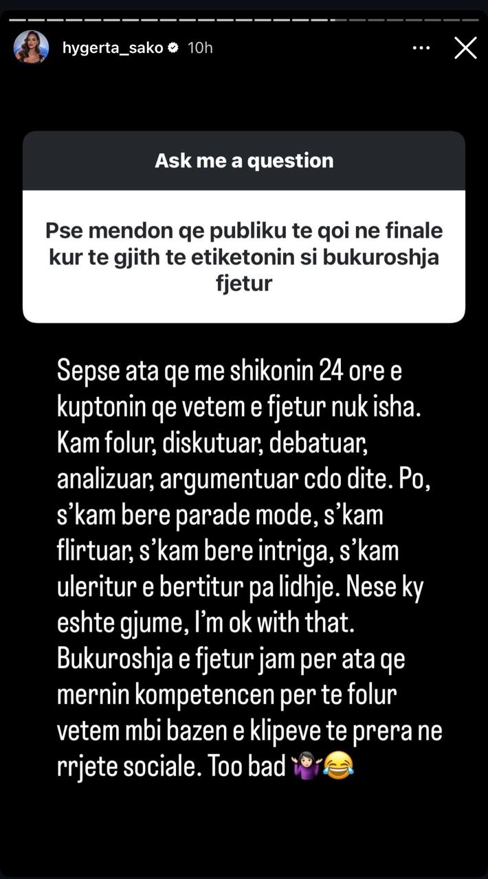 Hygerta Sako, e cila arriti të prekë finalen e rrugëtimit të saj në Big Brother, ka vendosur t’u përgjigjet drejtpërdrejt komenteve të atyre që e kanë etiketuar si “bukuroshja e fjetur” e këtij edicioni. Gjatë një komunikimi me ndjekësit në llogarinë e saj në Instagram, ajo është pyetur hapur nga një ndjekës se pse mendon që publiku e votoi për të shkuar në finale, kur të gjithë e komentonin se kishte shkuar deri aty duke fjetur gjumë dhe pa bërë debate.