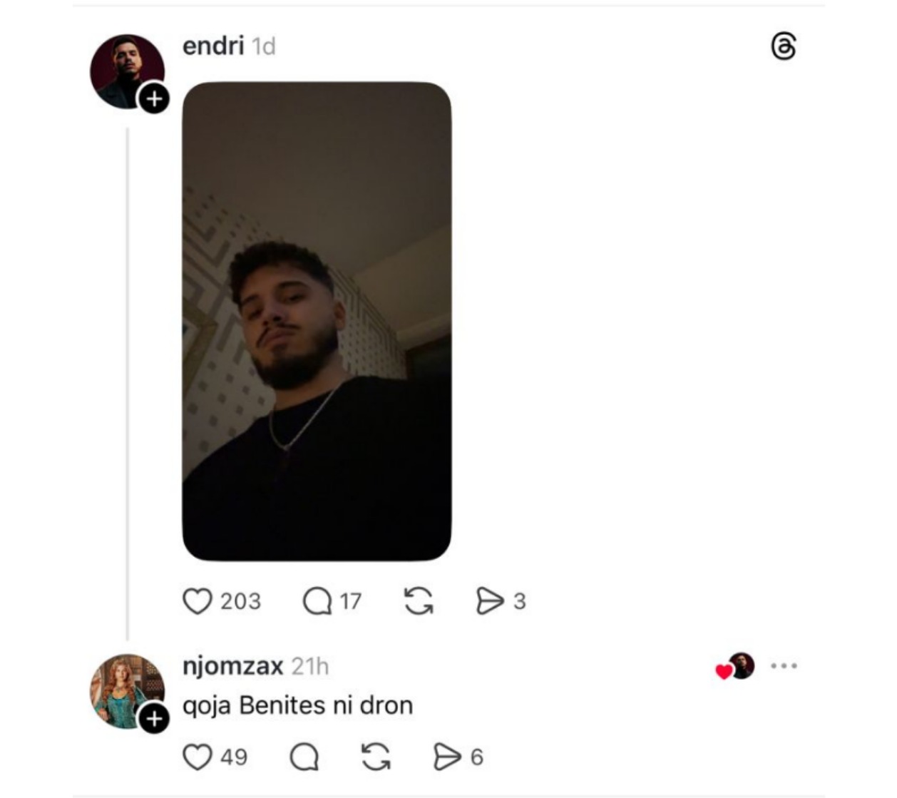 Endri ka zgjedhur rrjetet sociale për të dhënë një shenjë mbështetjeje, duke bërë “like” një koment mjaft domethënës nga një ndjekës. Në komentin që mori miratimin e tij, shkruhej: “Qoja Benitës nji dron”, një kërkesë kjo që tregon se fansat presin një gjest romantik prej tij për të surprizuar banoren.