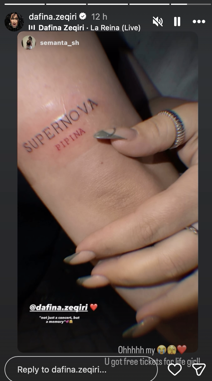Turneu “Supernova” i këngëtares Dafina Zeqiri po dëshmohet të jetë një nga projektet më të suksesshme dhe më ndikuese të karrierës së saj. Përtej performancave në skenë dhe atmosferës elektrizuese, ky tur ka krijuar një lidhje të jashtëzakonshme emocionale me publikun, aq sa një prej ndjekëseve më besnike ka vendosur ta bëjë këtë kujtim të përjetshëm në lëkurën e saj.