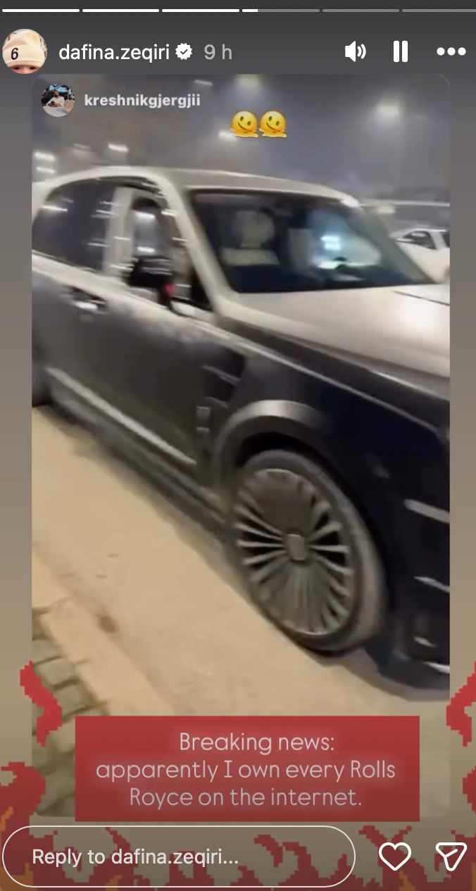 Përmes një postimi në Story, artistja ka publikuar pamje të makinës së saj të tipit Rolls-Royce, e cila shihet se është në gjendje perfekte dhe pa asnjë dëmtim.