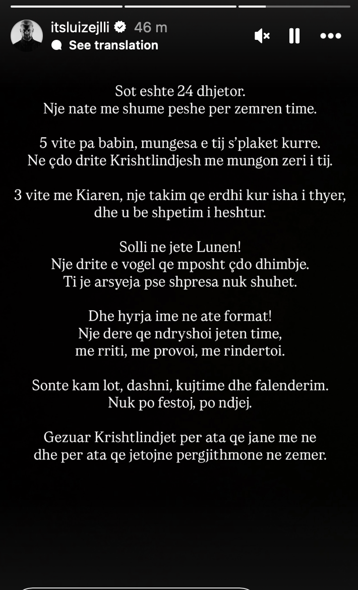 Luizi ka nisur mesazhin e tij me kujtimin e dhimbshëm për babanë e tij, i cili është ndarë nga jeta pesë vite më parë. “Mungesa e tij s’plaket kurrë,” shkroi ai, duke shtuar se në çdo dritë Krishtlindjesh i mungon zëri i të atit.