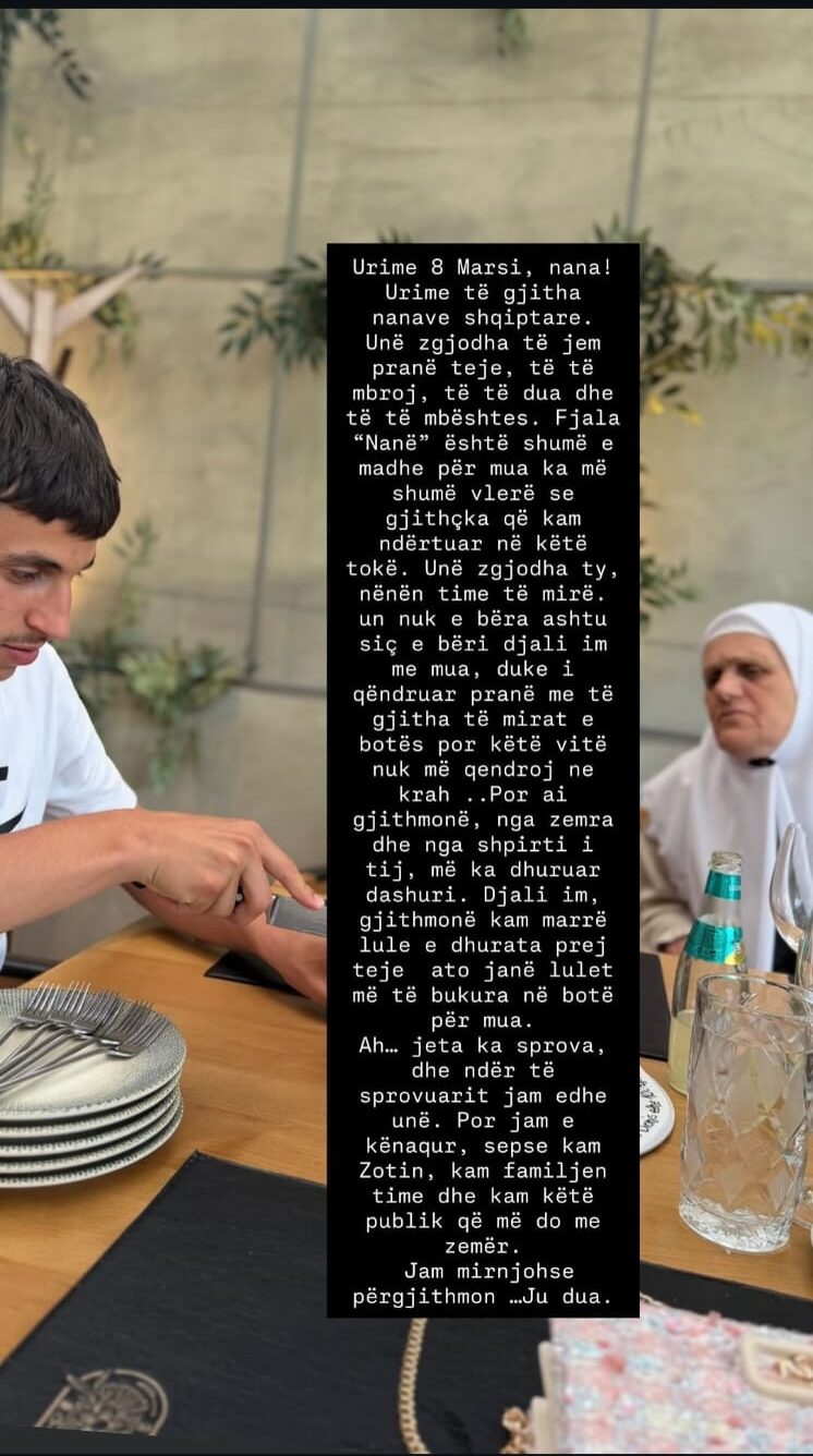Përmes një postimi, Fatlumja shprehet se ajo vetë zgjodhi t’i qëndrojë pranë nënës së saj për ta mbrojtur dhe mbështetur, por e njëjta gjë nuk ka ndodhur me djalin e saj drejt saj. “Unë zgjodha ty, nënën time të mirë. Unë nuk e bëra ashtu siç e bëri djali im me mua… këtë vit nuk më qëndroi në krah,” ka shkruar këngëtarja në InstaStory. Megjithatë, ajo thekson se i biri i ka dhuruar gjithmonë dashuri dhe lule në të kaluarën, kujtime që mbeten të shtrenjta për të.