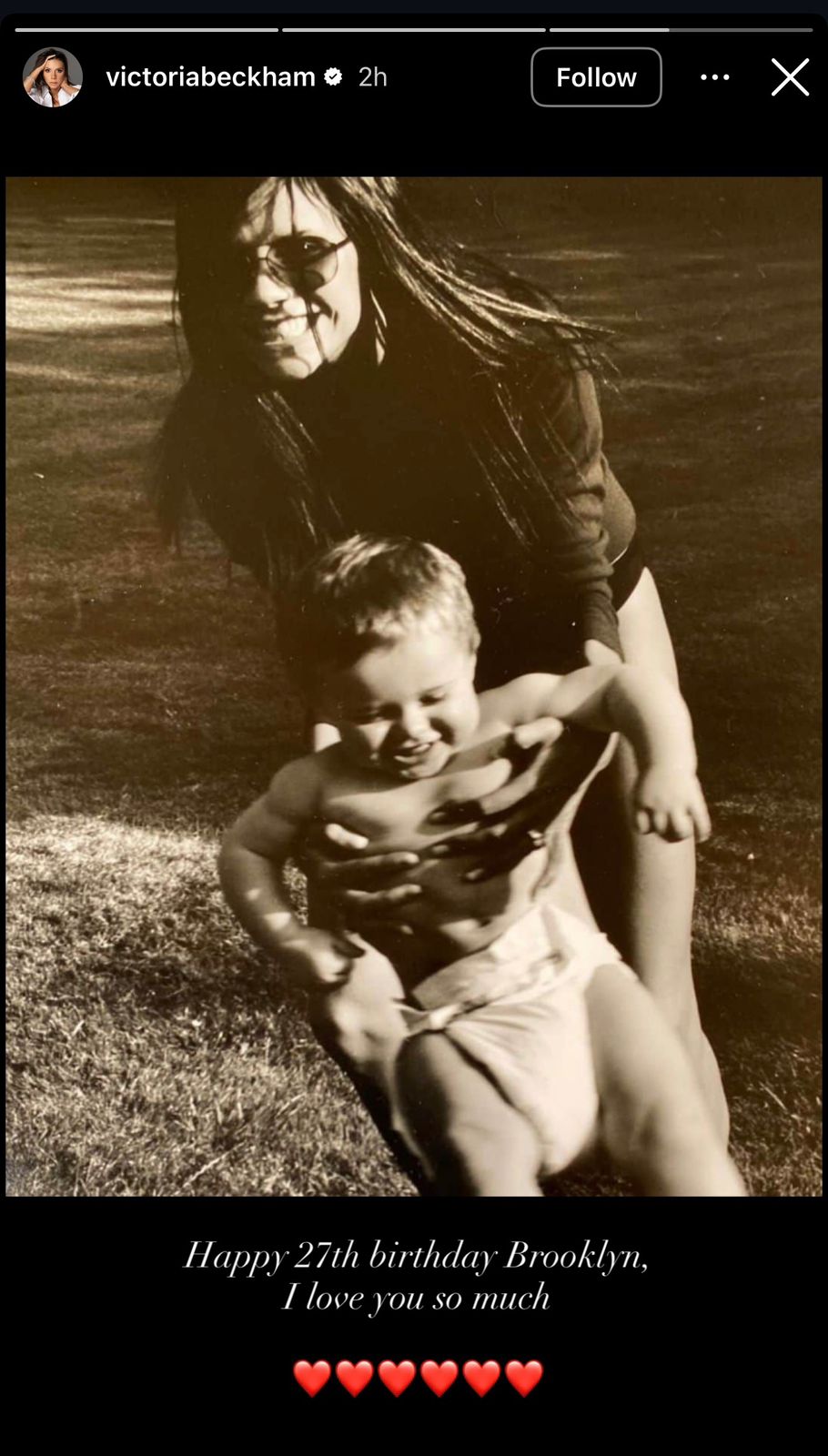 Në një prej fotove ku shfaqet ajo duke mbajtur djalin e vogël në krahë, Victoria ka shkruar: “Gëzuar ditëlindjen e 27-të Brooklyn, të dua kaq shumë”, shoqëruar me shumë zemra të kuqe. Ndërsa në një tjetër postim të ëmbël familjar në pishinë, ku shfaqet edhe David Beckham, ajo shton: “Gëzuar ditëlindjen Brooklyn, të duam shumë”.