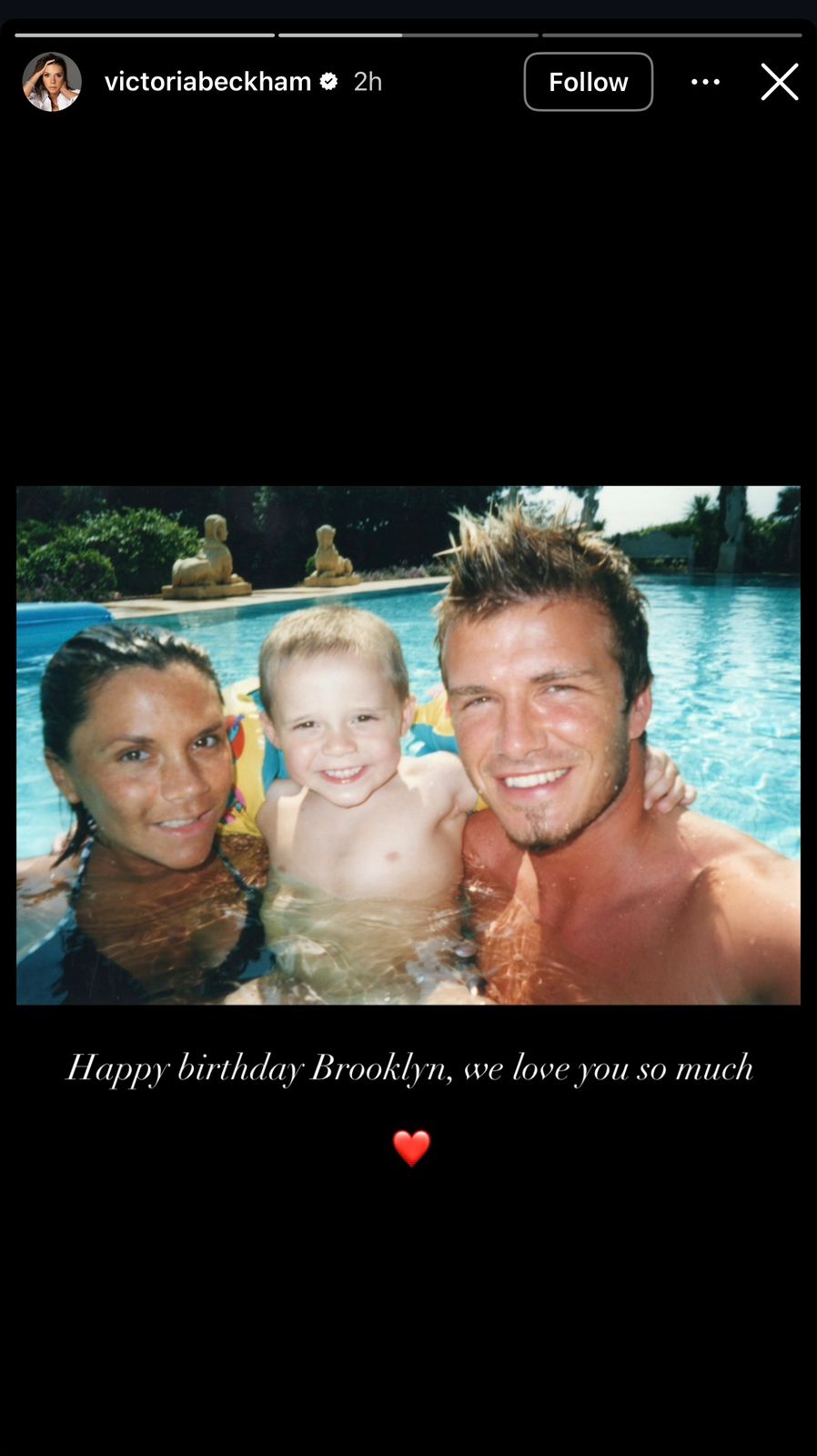 Në një prej fotove ku shfaqet ajo duke mbajtur djalin e vogël në krahë, Victoria ka shkruar: “Gëzuar ditëlindjen e 27-të Brooklyn, të dua kaq shumë”, shoqëruar me shumë zemra të kuqe. Ndërsa në një tjetër postim të ëmbël familjar në pishinë, ku shfaqet edhe David Beckham, ajo shton: “Gëzuar ditëlindjen Brooklyn, të duam shumë”.