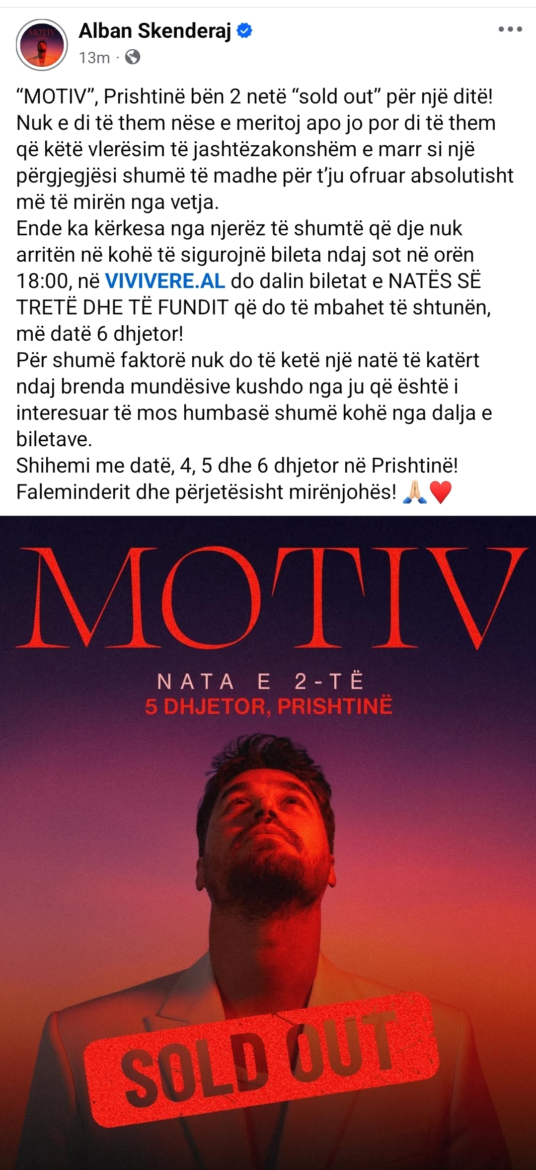 “Për shumë faktorë nuk do të ketë një natë të katërt, ndaj kushdo që është i interesuar, le të mos humbasë shumë kohë nga dalja e biletave”, shkruan ndër të tjera këngëtari, duke theksuar se biletat për natën e tretë do të dalin sot në orën 18:00 në Vivivere.al.