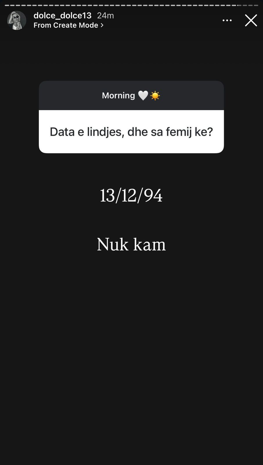 Tashmë, pas daljes nga shtëpia e BBVK, vetë Dolce ka vendosur të përballet me këto pyetje nga publiku. Gjatë një bashkëbisedimi virtual (“Ask”) me ndjekësit e saj në Instagram, ajo u pyet drejtpërdrejt për datën e lindjes dhe nëse është nënë. Dolce zbuloi saktë se ka lindur më 13/12/1994 dhe u përgjigj shkurt e qartë për fëmijët: “Nuk kam”.