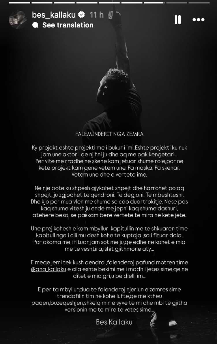 Besi e nis reagimin e tij duke e cilësuar këtë si projektin e tij më të bukur, ku nuk ka aktruar. “Në këtë projekt kam qenë vetëm unë. Pa maska. Pa skenar. Vetëm unë dhe e vërteta ime,” shkruan ai, duke falënderuar publikun për mbështetjen.