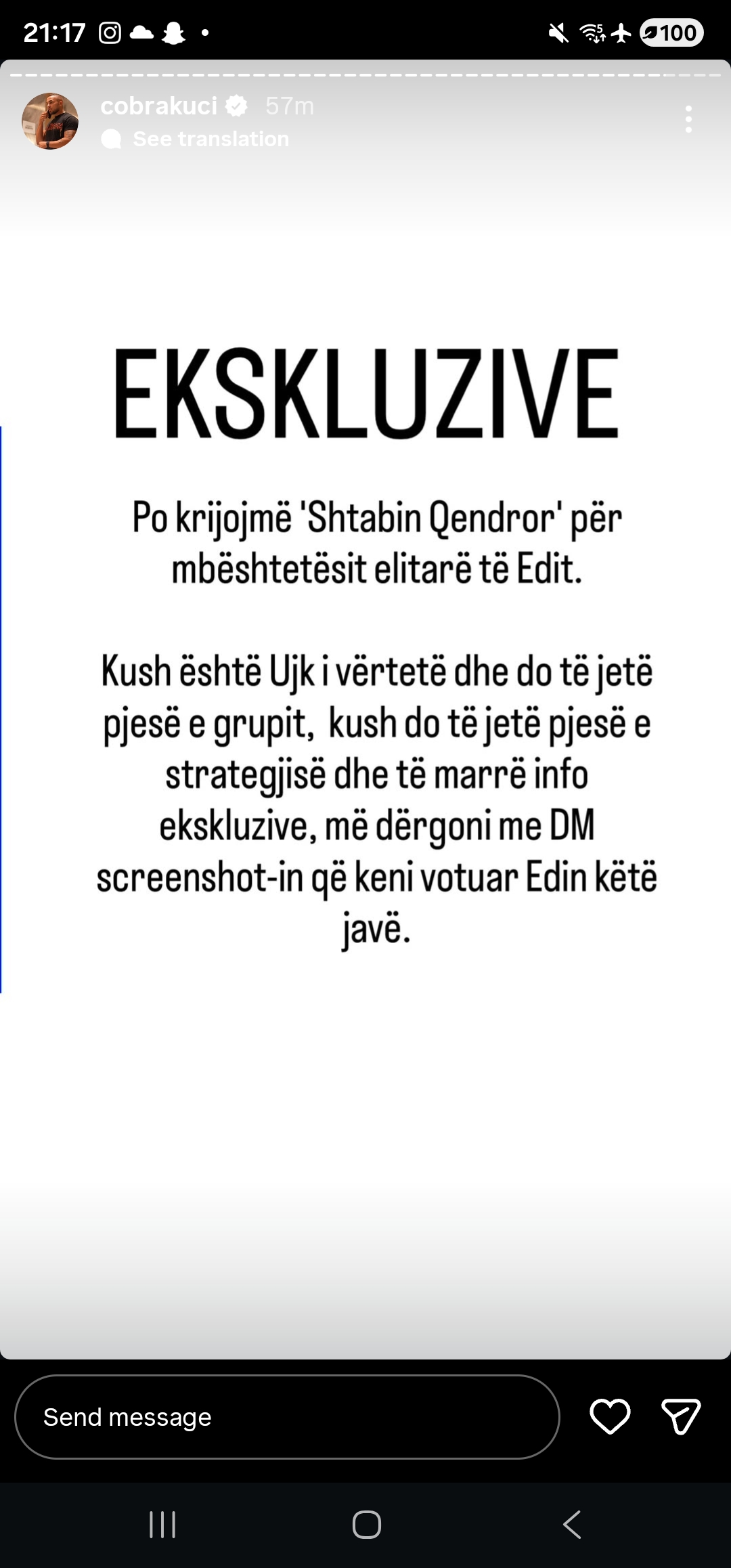 > “Më dërgoni me DM screenshot-in që keni votuar Edin këtë javë,” thuhet në njoftimin e bërë nga menaxhuesit e profilit të tij.