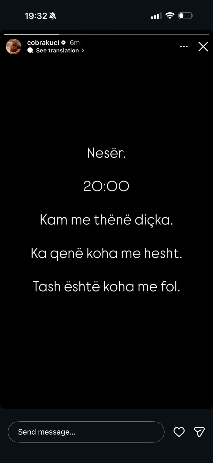 “Nesër. 20:00. Kam me thënë diçka. Ka qenë koha me hesht. Tash është koha me fol,” – shkruan ai në njoftimin e tij të shkurtër.