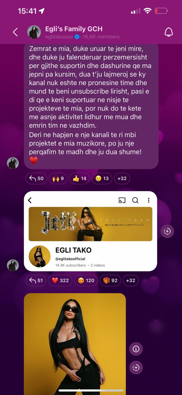 “Zemrat e mia, duke uruar të jeni mirë, dhe duke ju falënderuar përzemërsisht për gjithë suportin dhe dashurinë që ma jepni pa kursim, dua t’ju lajmëroj se ky kanal nuk është në pronësinë time dhe mund të bëni unsubscribe lirisht, pasi e di që e keni suportuar në nisje të projekteve të mia, por nuk do të ketë më asnjë aktivitet lidhur me mua dhe emrin tim në vazhdim.”