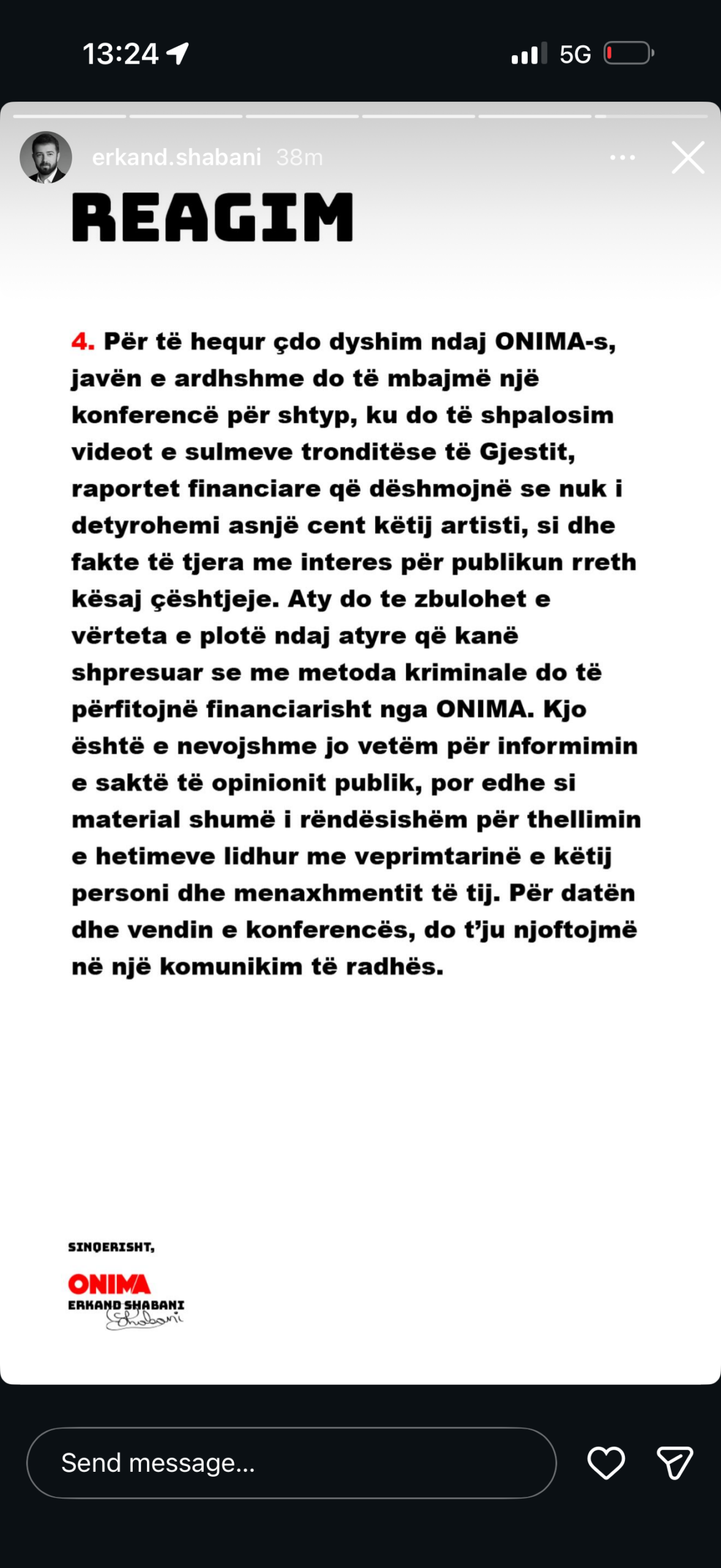 Shabani është deklaruar i vendosur, siç shprehet “për të nxjerrë zbuluar ata persona që kanë shpresuar të përfitojnë financiarisht nga ONIMA përmes metodave kriminale”. Sipas tij, publikimi i këtyre materialeve është i domosdoshëm jo vetëm për të informuar saktë opinionin publik, por edhe për t’i shërbyer thellimit të hetimeve lidhur me veprimtarinë e artistit dhe menaxhmentit të tij.