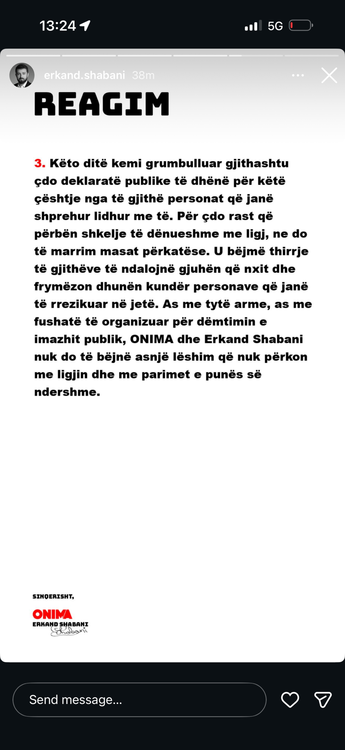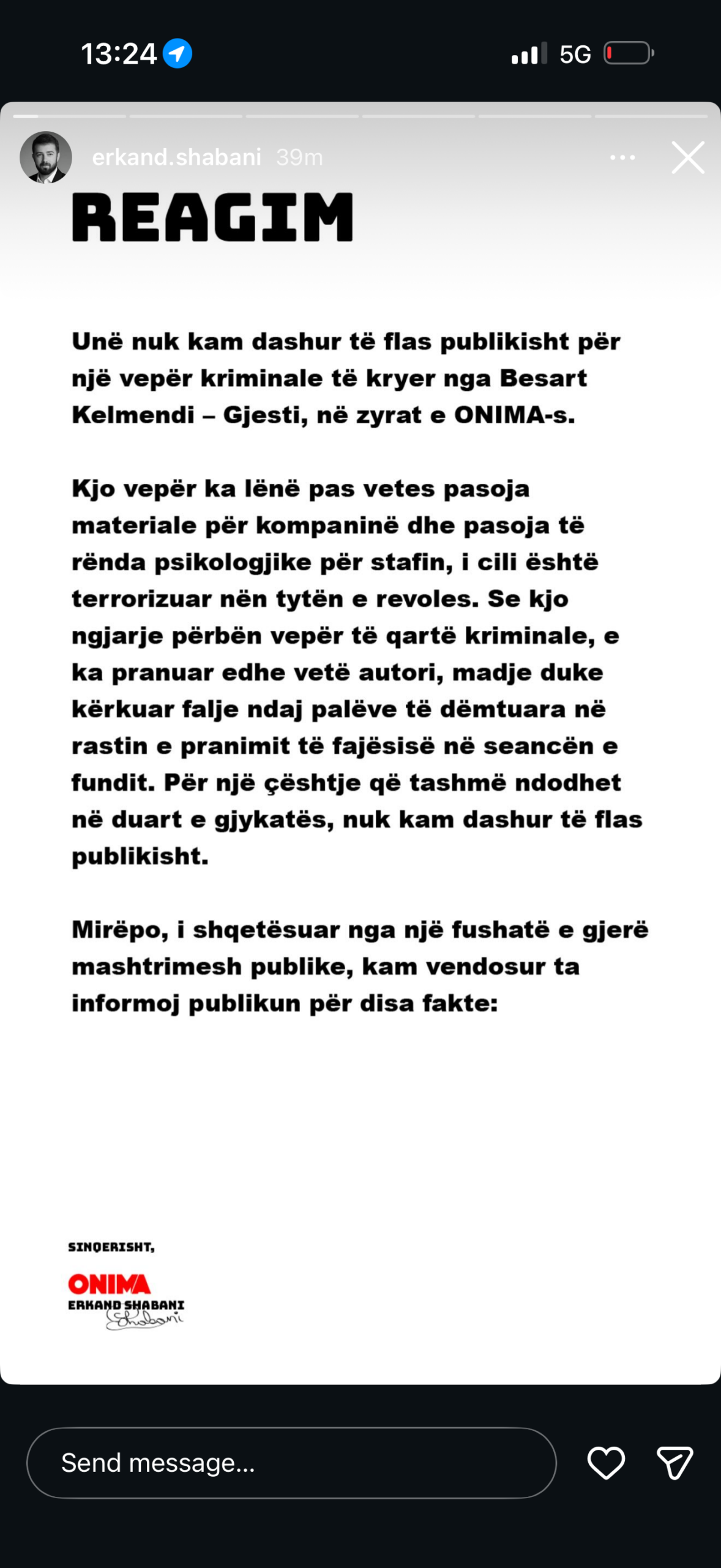 Pas arrestimit të këngëtarit Besart Kelmendi, i njohur si Gjesti, pronari i kompanisë Onima, Erkand Shabani, ka bërë reagimin e tij të parë të drejtpërdrejtë rreth incidentit në zyrat e tij.