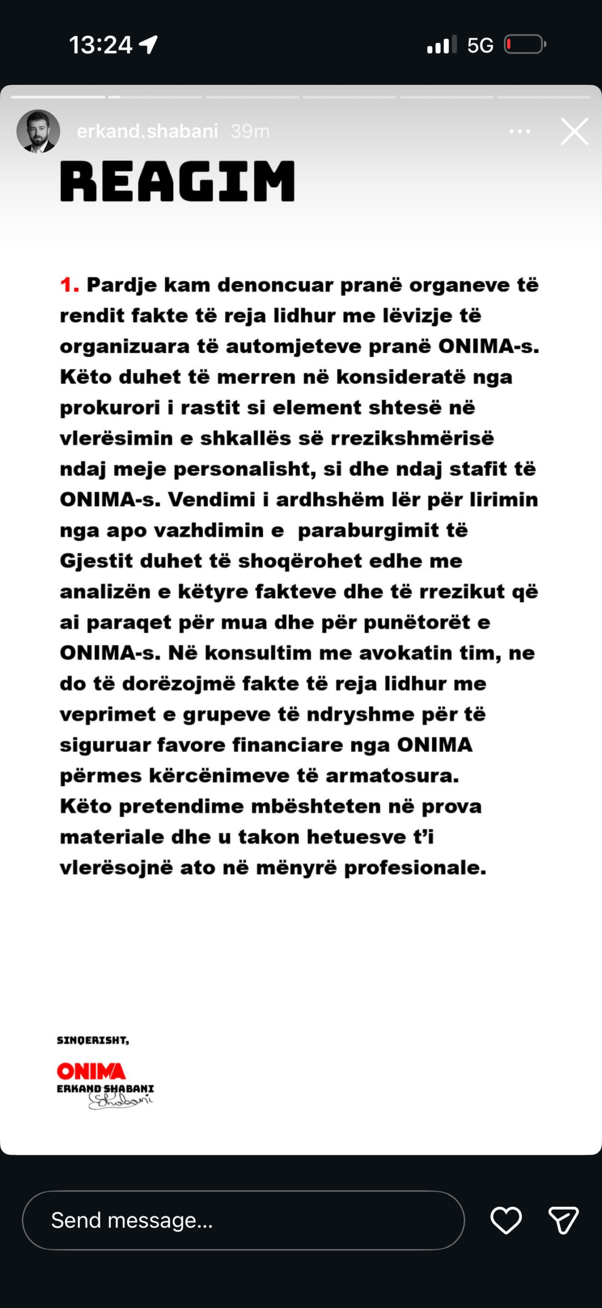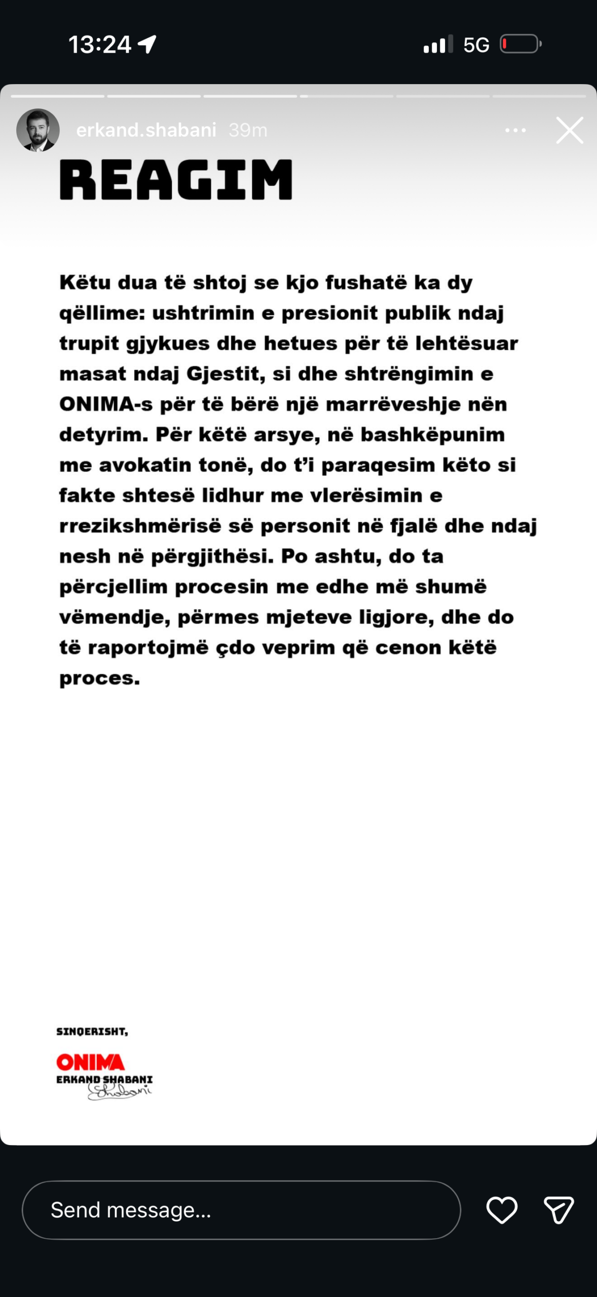 Shabani është deklaruar i vendosur, siç shprehet “për të nxjerrë zbuluar ata persona që kanë shpresuar të përfitojnë financiarisht nga ONIMA përmes metodave kriminale”. Sipas tij, publikimi i këtyre materialeve është i domosdoshëm jo vetëm për të informuar saktë opinionin publik, por edhe për t’i shërbyer thellimit të hetimeve lidhur me veprimtarinë e artistit dhe menaxhmentit të tij.