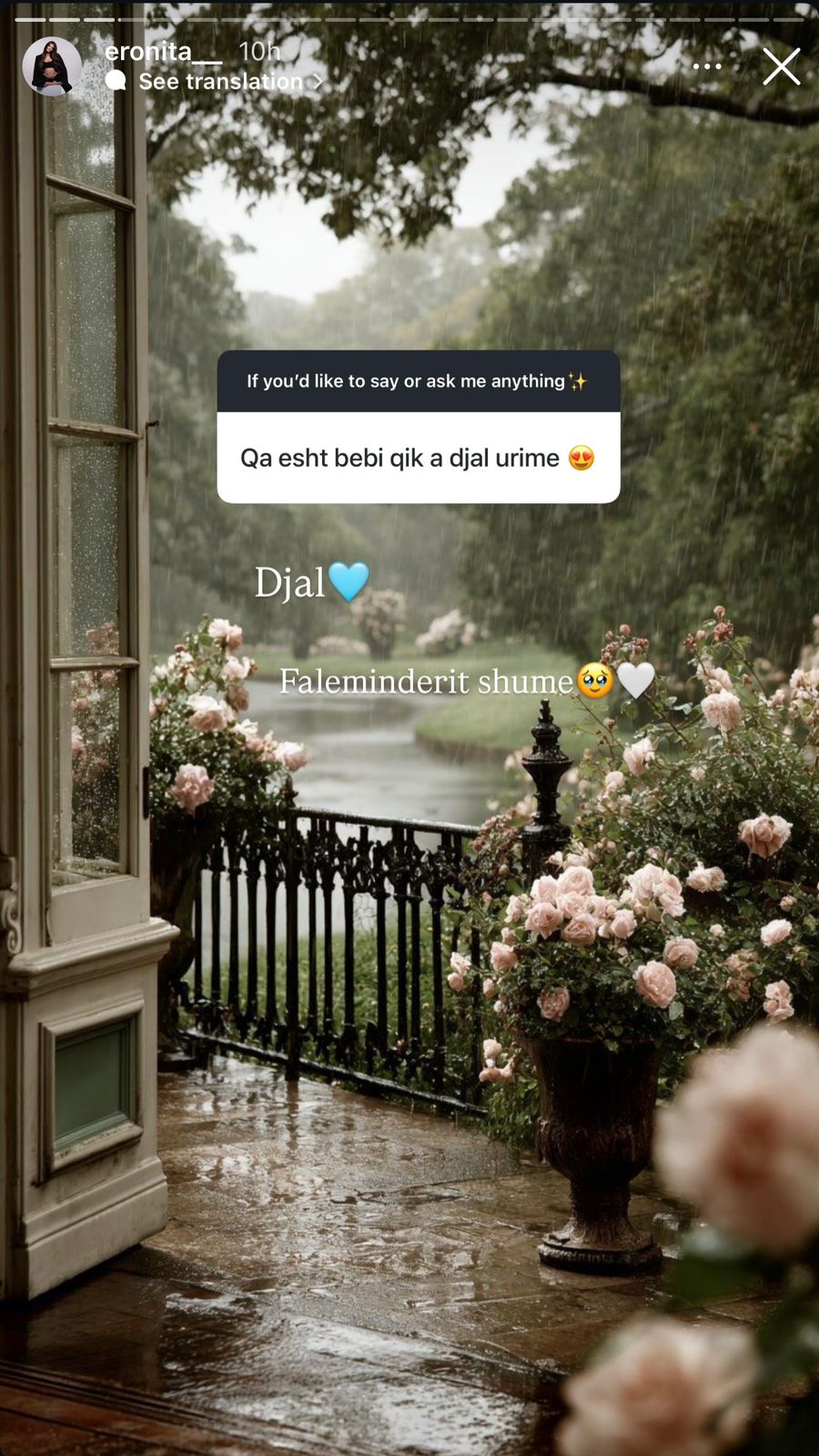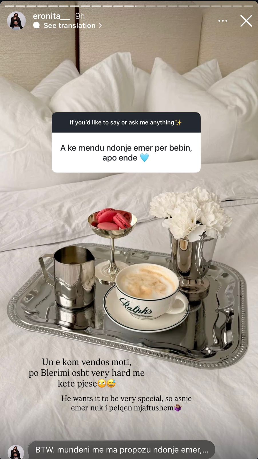 Në fund, ajo ka ndarë edhe një moment mjaft simpatik dhe të përditshëm të çiftit lidhur me zgjedhjen e emrit të vogëlushit. Ndonëse vetë Eronita e ka vendosur prej kohësh të preferuarin e saj, duket se Blero është më kërkues. “Ai dëshiron që të jetë shumë i veçantë, ndaj asnjë emër nuk i pëlqen mjaftueshëm”, ka shkruar.