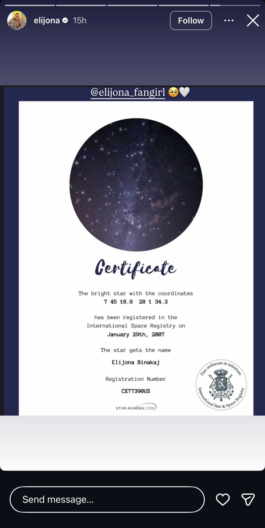 Përmes një fotografie të publikuar në Instastory, Elijona ka treguar një certifikatë ku shihet se një fans ka “regjistruar” një yll në hapësirë me emrin e saj të plotë.