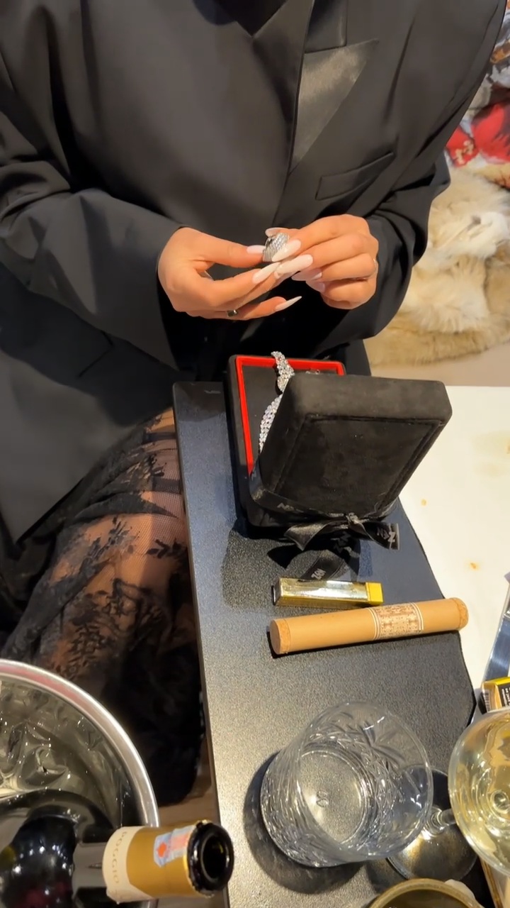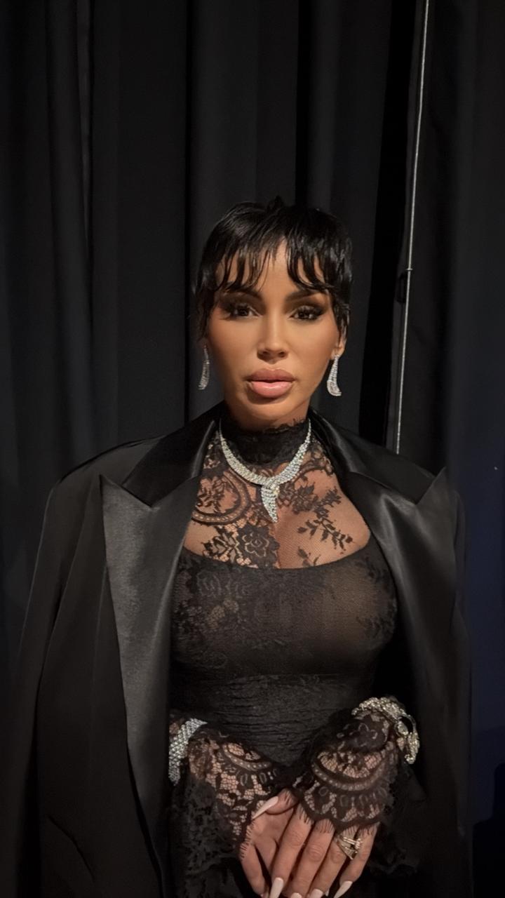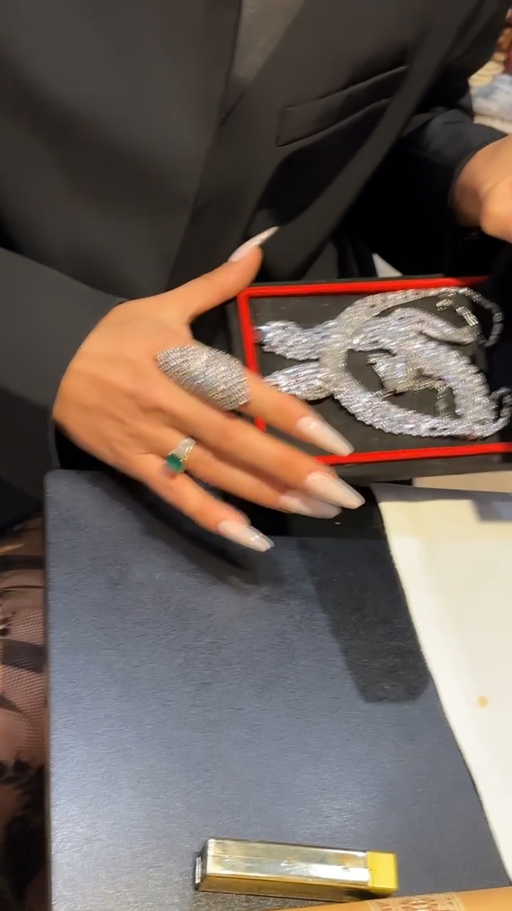 Fjolla u shfaq e veshur me një bluzë të zezë me dantellë transparente dhe një xhaketë serioze, por detaji kryesor ishin bizhuteritë. Këngëtarja u sigurua që të ishte fjalë për fjalë “full diamante”, ashtu siç theksohet edhe nga pamjet e afërta nga prapaskenat. Ajo mbante një varëse masive të kombinuar me vathë të mëdhenj, një byzylyk mjaft të rëndë dhe unaza që mbulonin gishtat, përfshirë edhe një gur të madh të gjelbër.