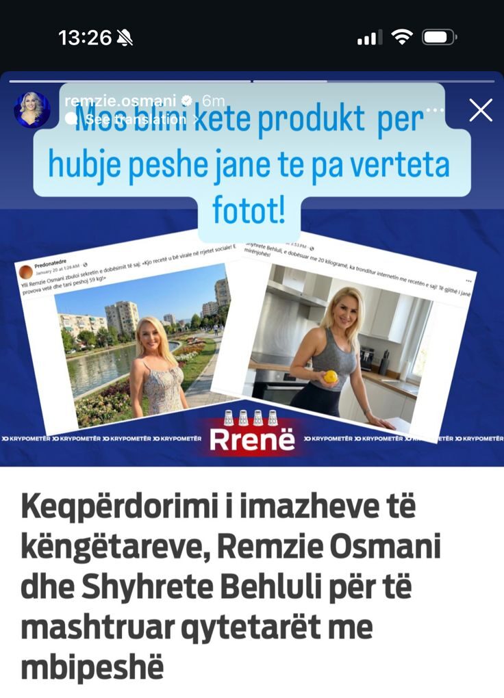 Përmes një mesazhi të qartë mbi fotot e manipuluara, Remzia u ka bërë thirrje qytetarëve që të mos bien pre e këtyre rrenave. “Disa foto që po qarkullojnë janë të krijuara me AI. Janë të pavërteta dhe nuk pasqyrojnë gjendjen time reale,” ka shkruar ajo, duke sqaruar se inteligjenca artificiale është përdorur për të tjetërsuar fizikun e saj në këto reklama mashtruese.