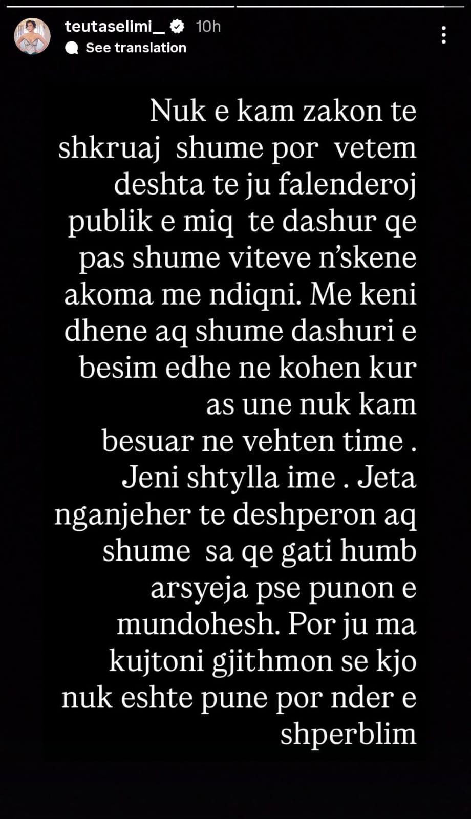 “Më keni dhënë aq shumë dashuri e besim edhe në kohën kur as unë nuk kam besuar në veten time,” shkruan Teuta, duke konfirmuar kështu në mënyrë indirekte periudhën e vështirë.