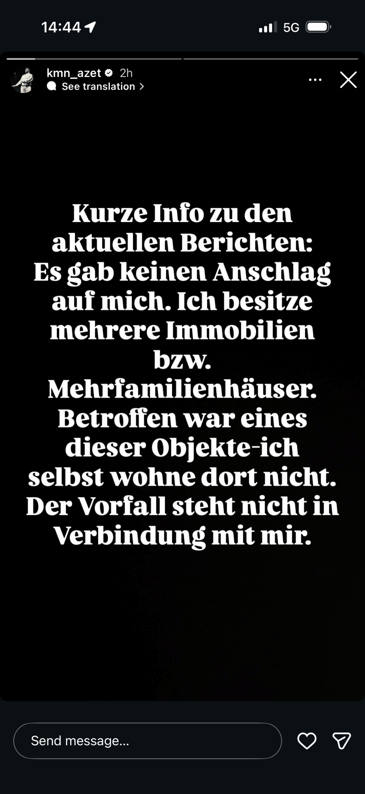 “Informacion i shkurtër në lidhje me raportet aktuale: Nuk ka pasur asnjë sulm ndaj meje. Unë posedoj disa prona respektivisht ndërtesa me shumë apartamente. I prekur ishte një nga këto objekte – unë vetë nuk banoj atje. Incidenti nuk ka lidhje me mua.”