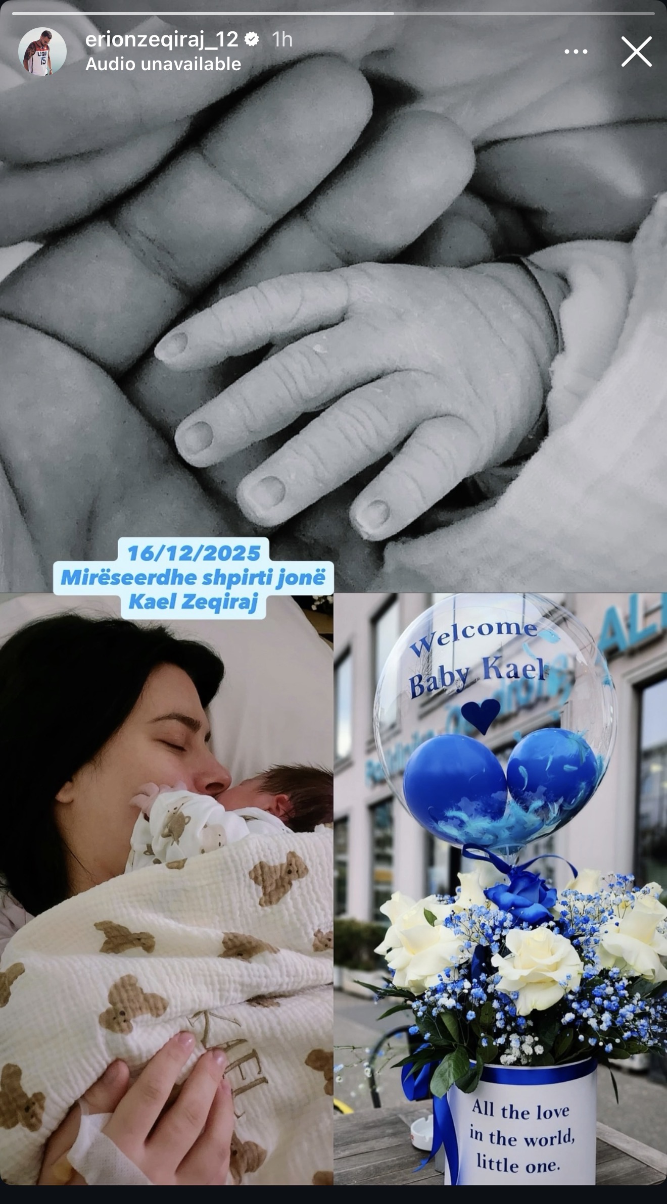 Krahas fotos bardhë e zi, ku shihet dora e të sapolindurit, Erioni ka shkruar fjalët e ndjera: “16/12/2025. Mirëseerdhe shpirti jonë, Kael Zeqiraj.”