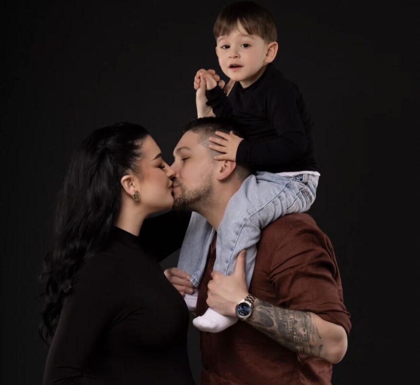 Në foton e ndarë me publikun, ish-banori shfaqet në një moment mjaft romantik duke puthur partneren e tij, e cila tashmë e ka barkun e rrumbullakosur, ndërsa në supe mban djalin e tyre të parë.