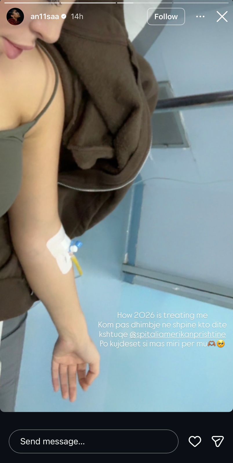 Përmes një fotografie të ndarë në Instagram Story, ajo është shfaqur në ambientet e një spitali duke marrë infuzion.
