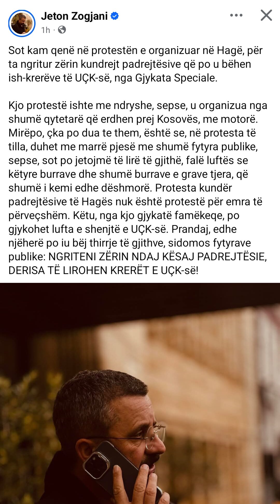 Aktori i njohur Jeton Zogjani ka reaguar pas pjesëmarrjes së tij në protestën e organizuar në Hagë, ku qindra qytetarë nga Kosova, përfshirë edhe motoristë, ngritën zërin kundër padrejtësive që po u bëhen ish-krerëve të UÇK-së nga Gjykata Speciale.