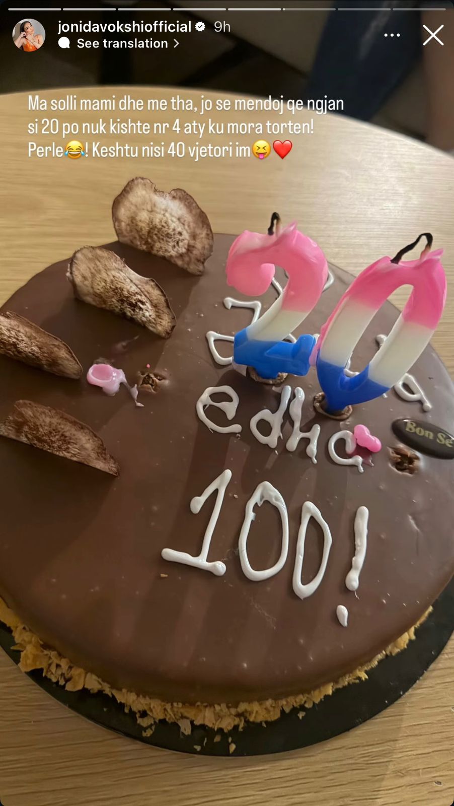 Në llogarinë e saj në Instagram, Jonida ka ndarë me ndjekësit një moment shumë komik për të treguar se si i ka nisur dita. Nëna e saj e ka surprizuar me një tortë, por në vend të moshës së saj të vërtetë, qirinjtë tregonin numrin “20”. Moderatorja e ka shpjeguar këtë situatë me shumë humor në Instastory: