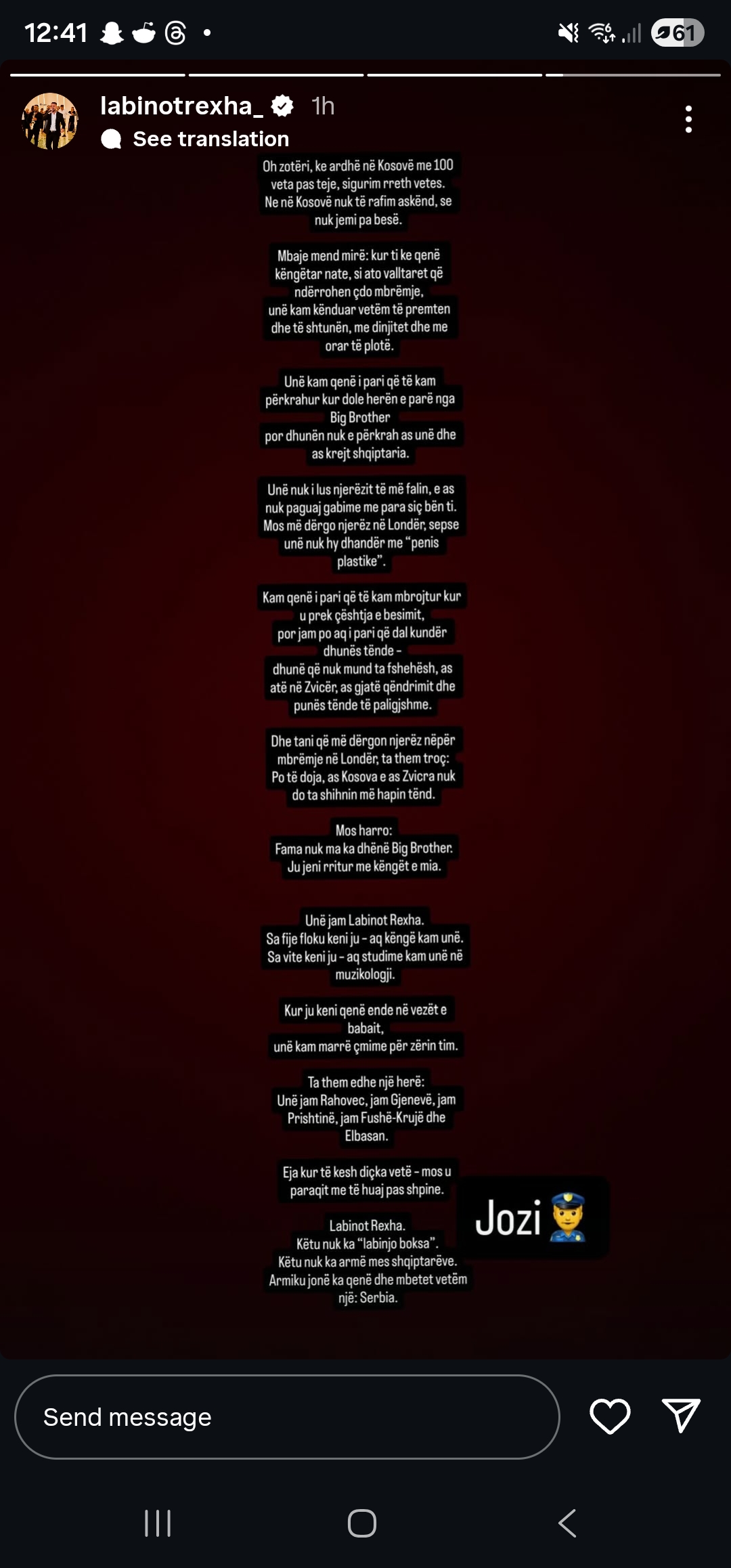 Labinot Rexha, i njohur si “Labi”, ka publikuar një tekst të gjatë në formën e një “diss”-i në Instastory, ku nuk i kursen akuzat e rënda ndaj personit që e quan “Jozi”.