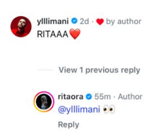 Në një postim të fundit të Ritës, Ylli ka komentuar me thjeshtësi “RITAAA ❤️”, ndërsa përgjigjja e menjëhershme e super-yllit me origjinë nga Kosova “@ylllimani 👀” ka mjaftuar që ndjekësit të shpërthejnë me teori e aludime për një bashkëpunim të mundshëm.