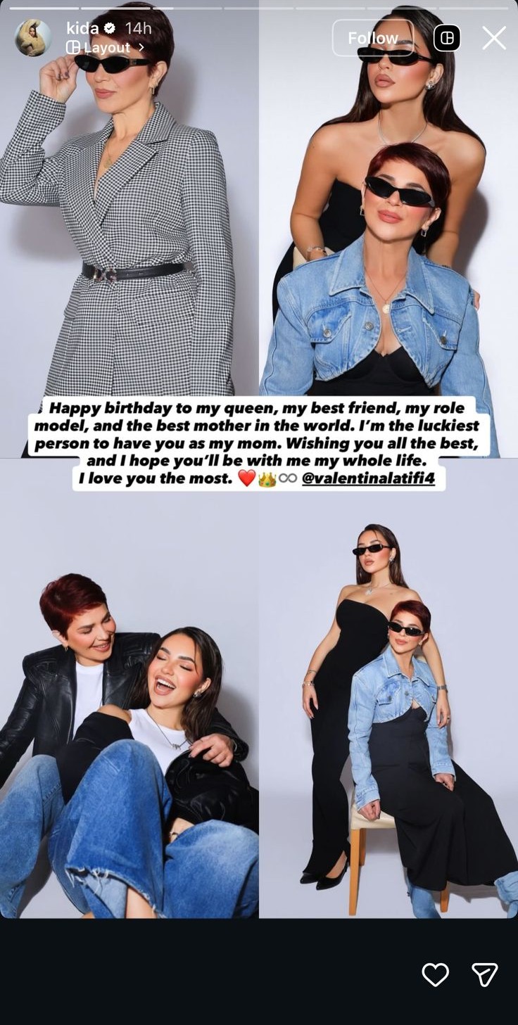 Përmes një kolazhi fotosh plot stil dhe dashuri, Kida nuk i ka kursyer fjalët më të ndjera për ta përshkruar marrëdhënien e ngushtë që gëzon me të ëmën, duke e konsideruar atë si udhërrëfyesen e saj kryesore në jetë.
