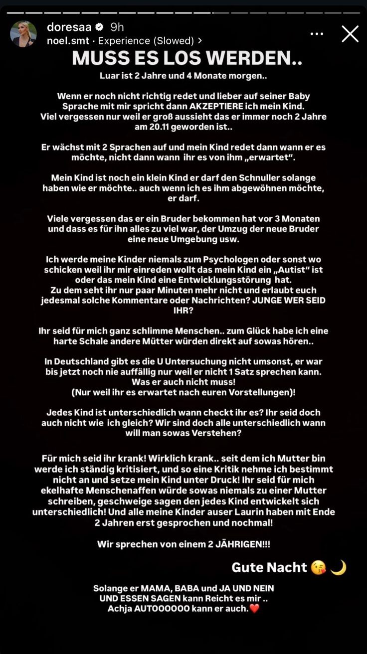 Me anë të një postimi, Doresa theksoi me forcë se çdo fëmijë ka ritmin e tij unik të rritjes. Ajo u kujtoi ndjekësve se djali i saj po rritet në një mjedis me dy gjuhë dhe ka përjetuar ndryshime të mëdha së fundmi, siç ishte ardhja në jetë e vëllait të tij të vogël pak muaj më parë.