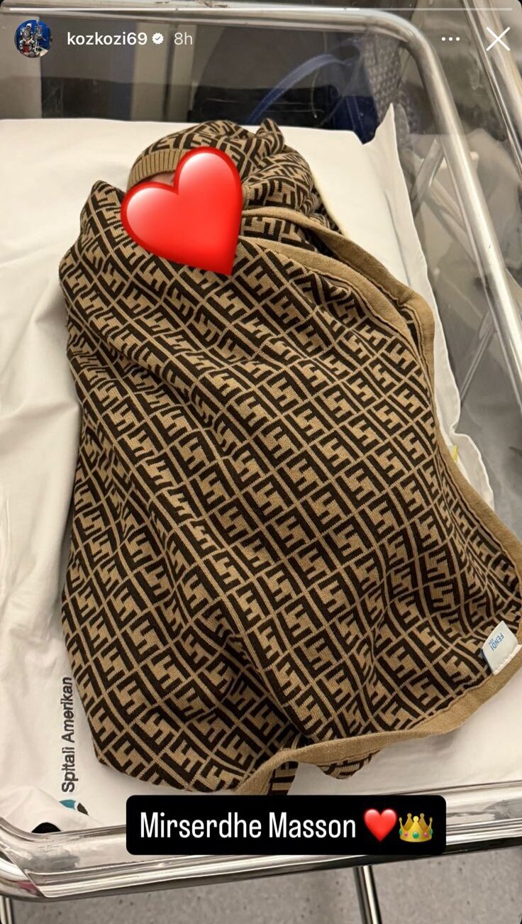 Ai ka publikuar foton e parë të foshnjës së porsalindur, të mbështjellë me batanije në ambientet e spitalit, ndërsa portretin e të voglit ka zgjedhur ta mbulojë me një emoji zemre të kuqe për të ruajtur privatësinë.