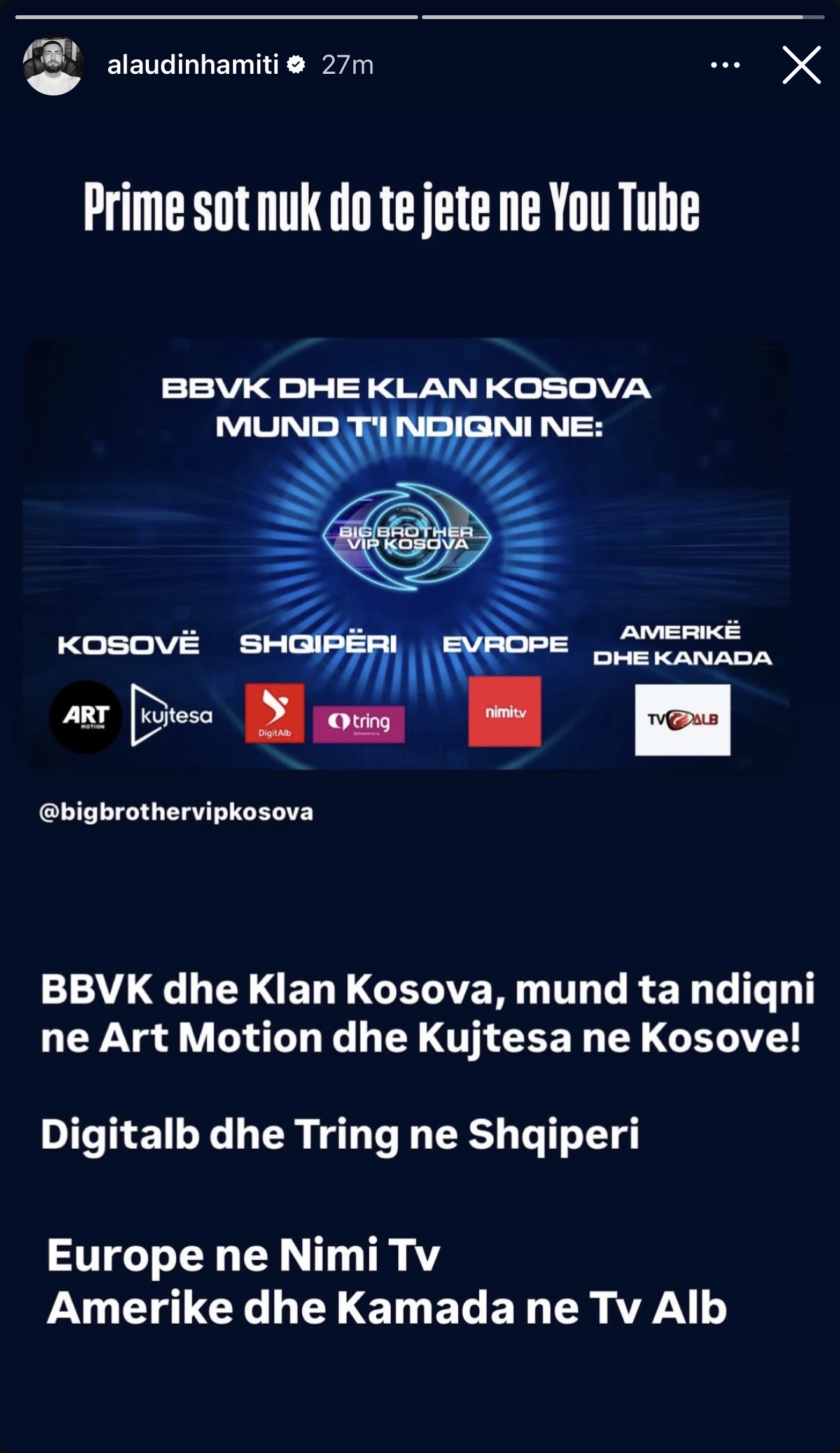 Lajmi është konfirmuar pak minuta më parë nga vetë moderatori i programit, Alaudin Hamiti. Përmes një postimi në Instagram, ai ka njoftuar ndjekësit se “Prime sot nuk do të jetë në YouTube”, duke i dhënë fund çdo paqartësie për ata që prisnin transmetimin online.