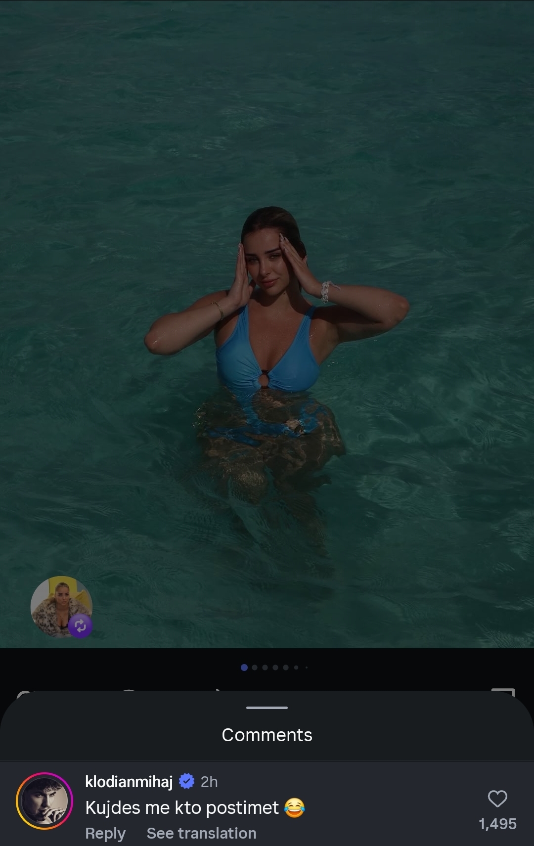Ndërkohë, gjatë pushimeve të Klodit në jug të vendit, Elijona ka ndërhyrë në komente për të kërkuar autorësinë e njërit prej imazheve duke shkruar: “cr: last pic @elijona”. Përgjigjja e Klodit ishte me shaka: “Hera e parë që po frymëzon ngl”.