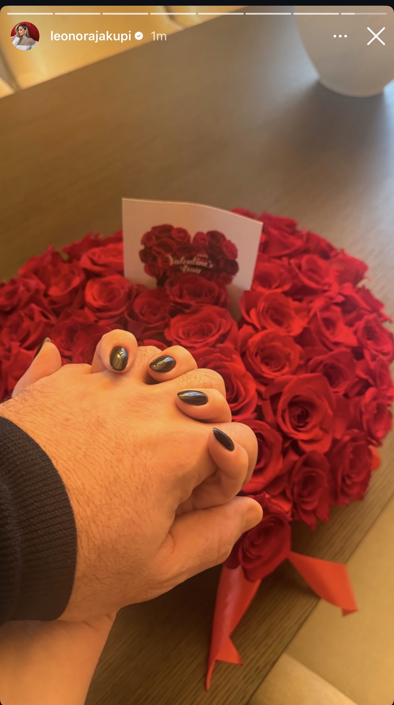 Në foton e postuar së fundmi në rrjetet sociale, këngëtarja shfaqet duke shtrënguar duart me personin e saj të zemrës, mbi një tufë gjigante me trëndafila të kuq.