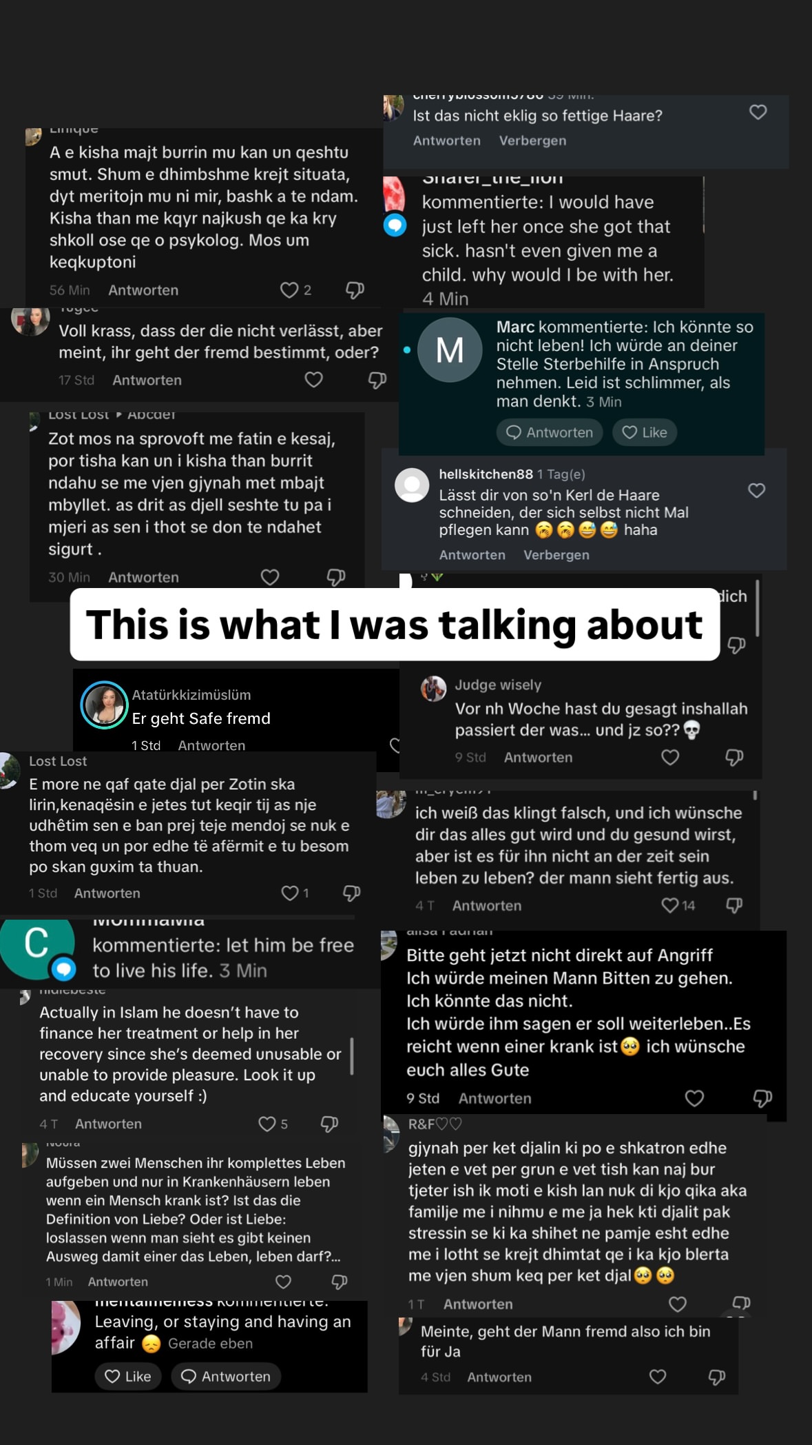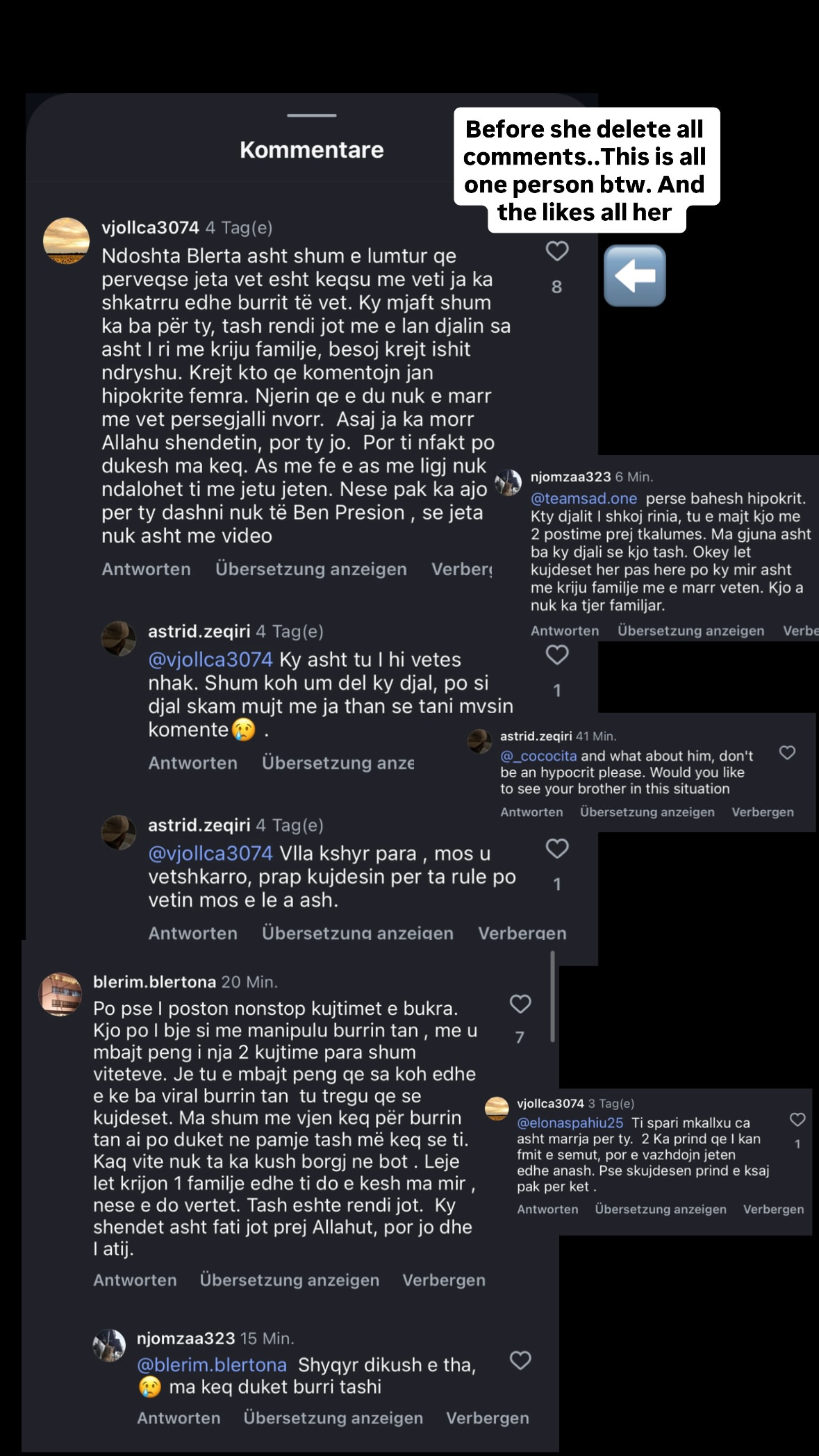 1. Akuza për egoizëm vdekjeprurës: Në një nga komentet më të rënda, ndjekësja shkruan: “Njerin që e du, nuk e marr me vete për së gjalli në varr.” Ky koment çnjerëzor nënkupton se sëmundja e Blertës është një “varr” për Bleron dhe se ajo, nga dashuria, duhet ta braktisë atë.