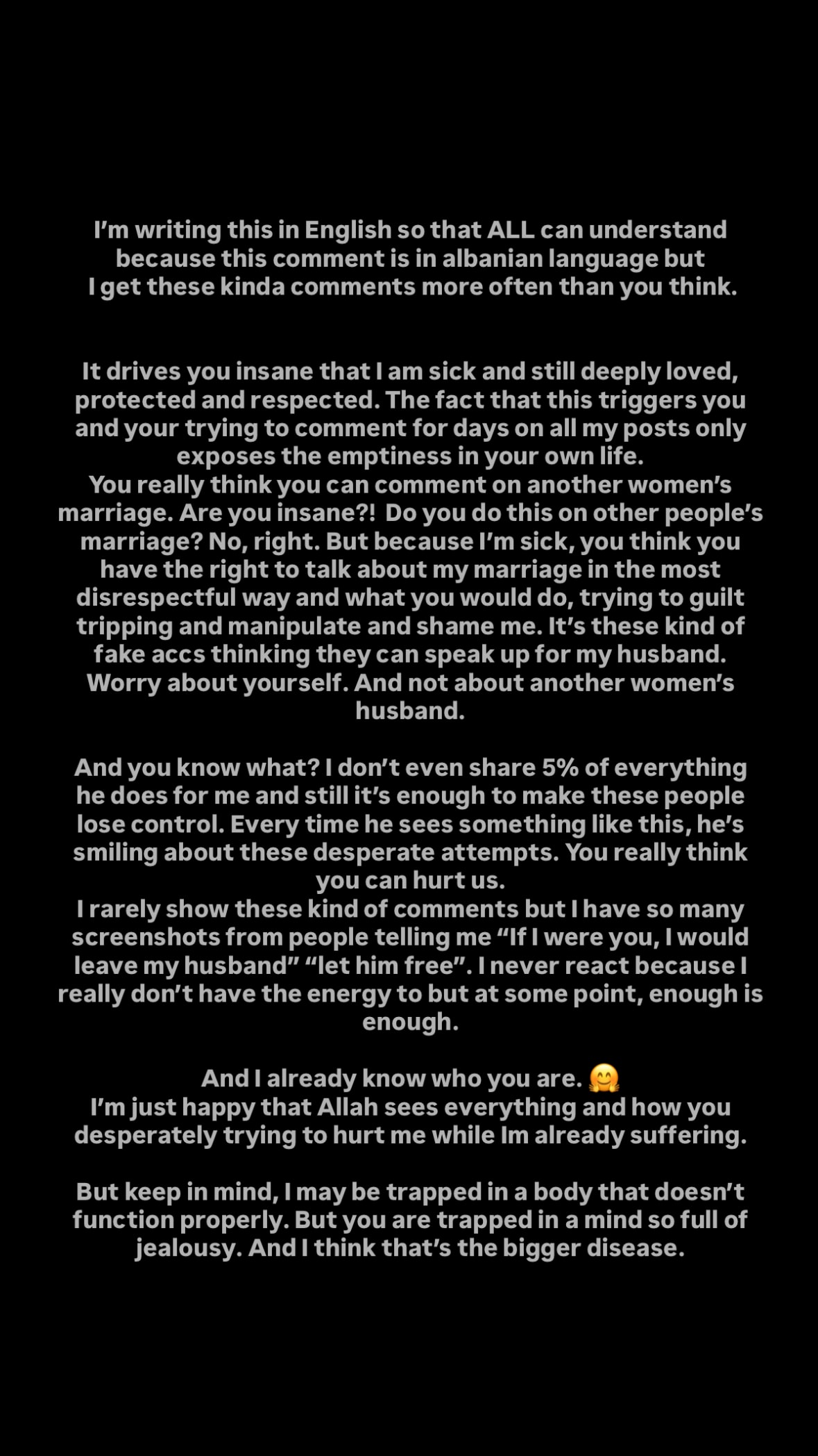 “Ju çmend fakti që unë jam sëmurë dhe prapëseprapë jam thellësisht e dashur, e mbrojtur dhe e respektuar,” – shkruan ajo në reagimin e saj në anglisht. “Unë nuk ndaj as 5% të asaj që ai bën për mua… Sa herë që ai sheh komente të tilla, vetëm buzëqesh me këto përpjekje të dëshpëruara.”